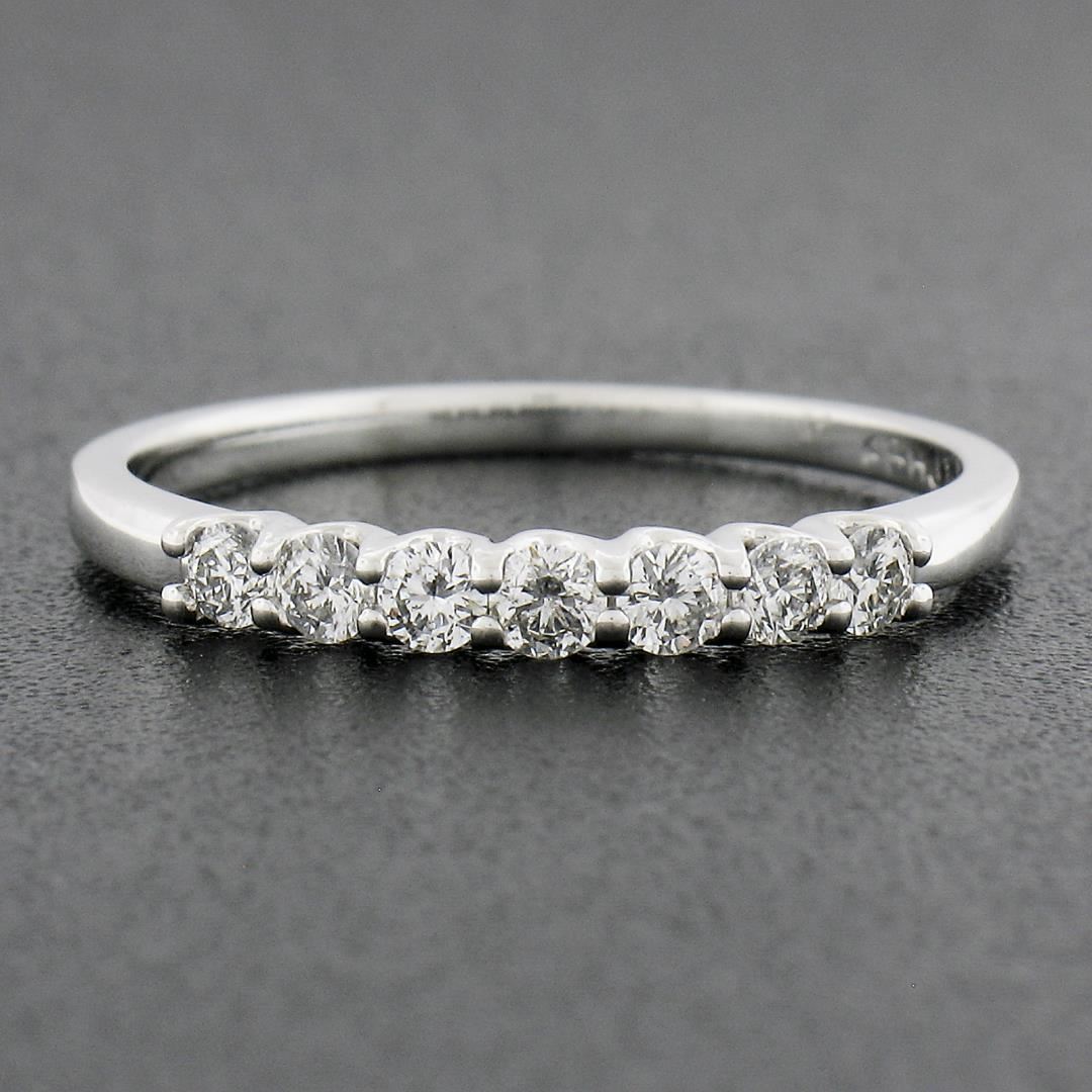 A solid 14k white gold band ring, with 7 round cut natural diamonds (G/H - SI1/SI2 ; 0.30ctw). The ring is size 6.5, weighs a total of 1.47 grams, and measures 2.3mm wide.