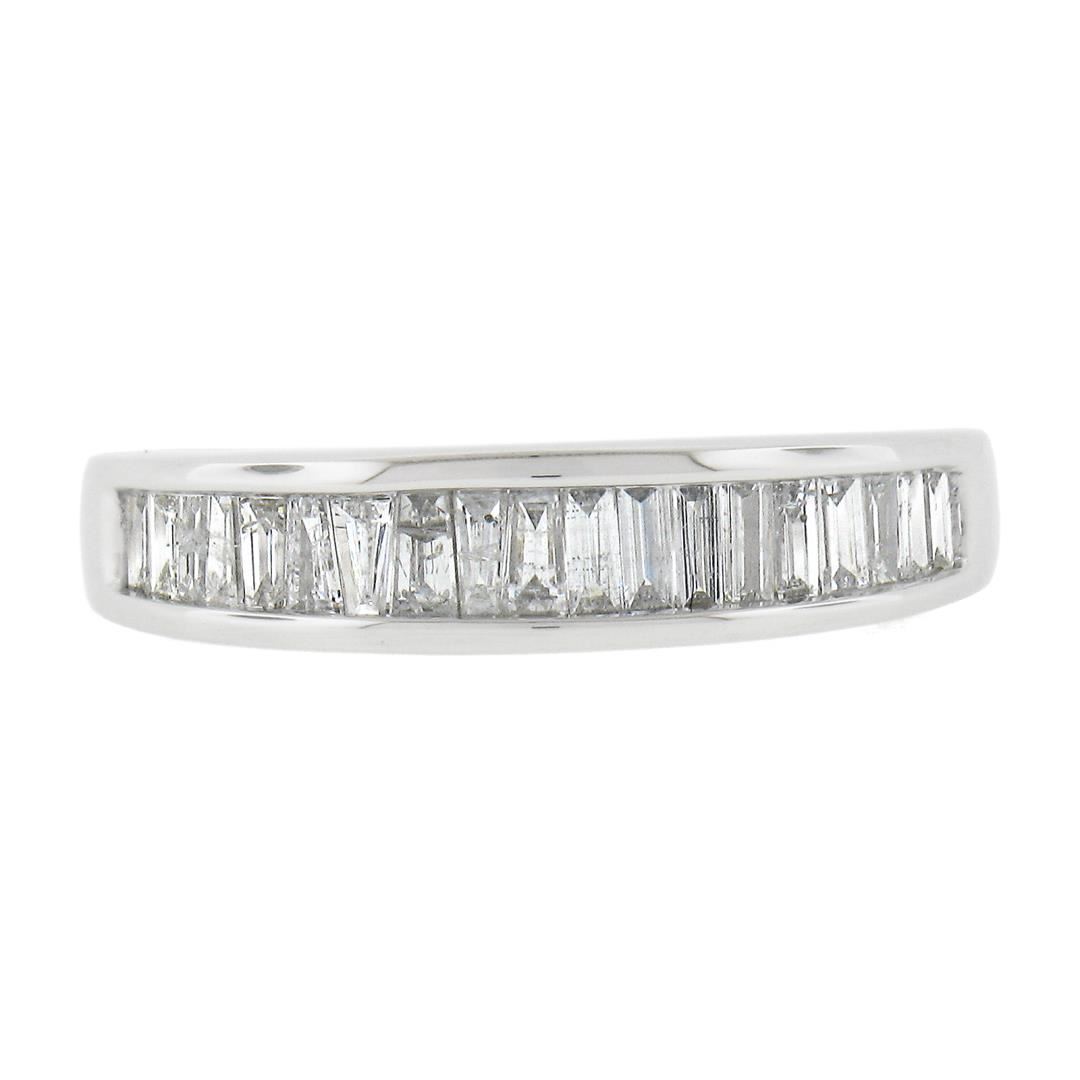 A solid 14k white gold stack band ring, with 19 baguette cut natural diamonds (F/G - SI1-I2 ; 0.60ctw). The ring is size 7.0, weighs a total of 2.83 grams, and measures 4.6mm wide.