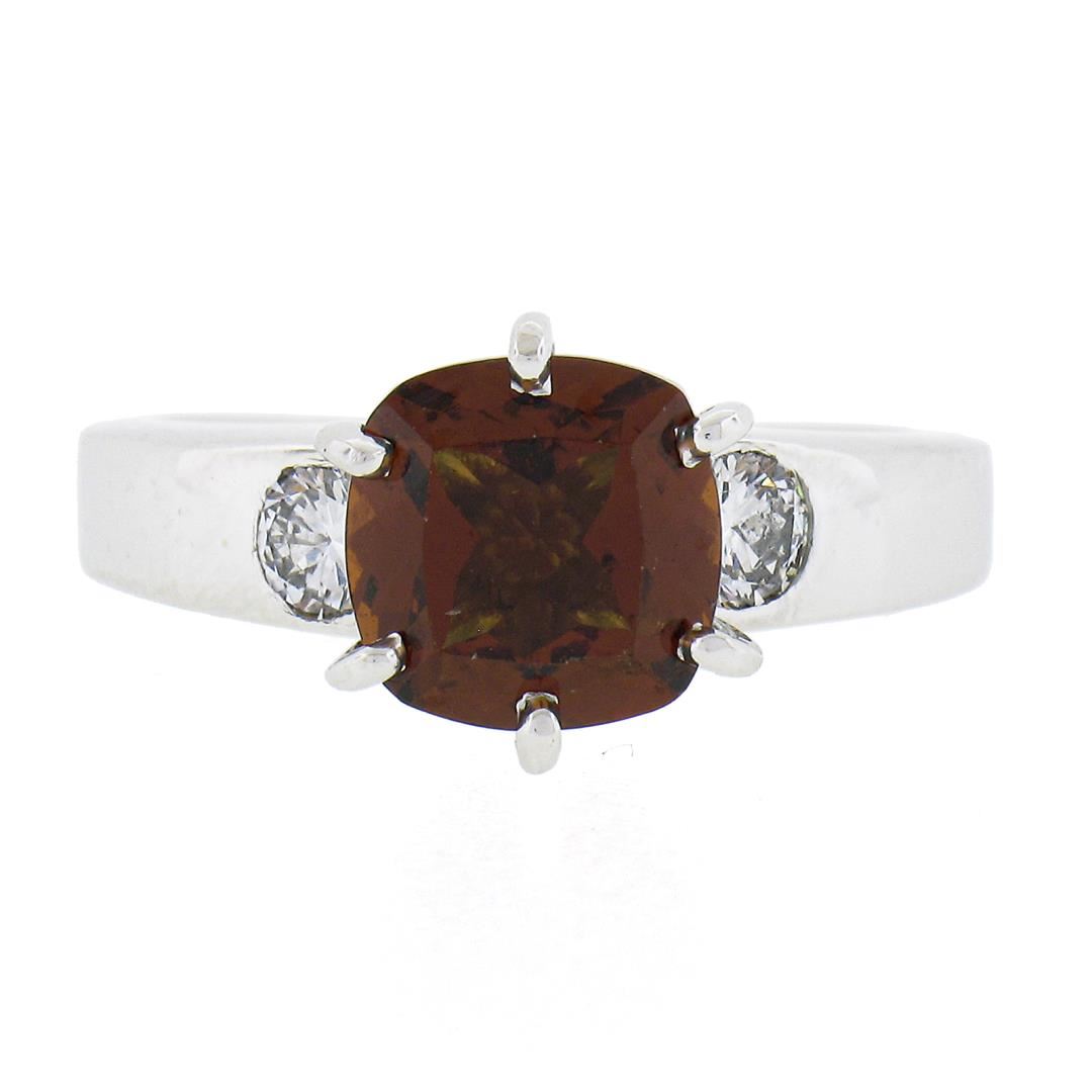 A solid 14k white gold ring, with 1 cushion cut natural cirtine (7.8x8mm), and 2 round cut natural diamonds (H/I- VS1/VS2 ; 0.40ctw). The ring is size 6.75, weighs a total of 6.60 grams, and measures 9.9mm wide.