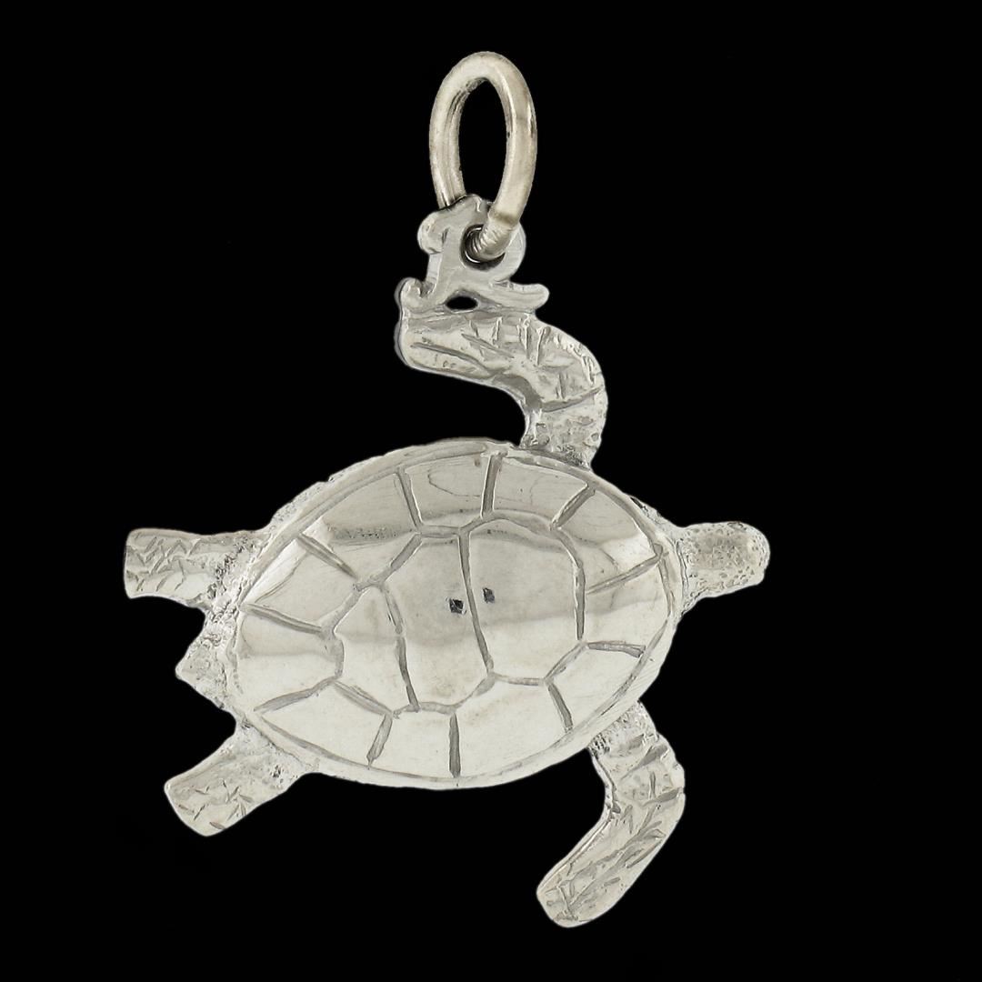 A solid 14k white gold turtle pendant charm. The pendant weighs a total of 2.72 grams, measures 24.6x17.9mm including the bail, and the inside of the bail measures 3.1x4.3mm.
