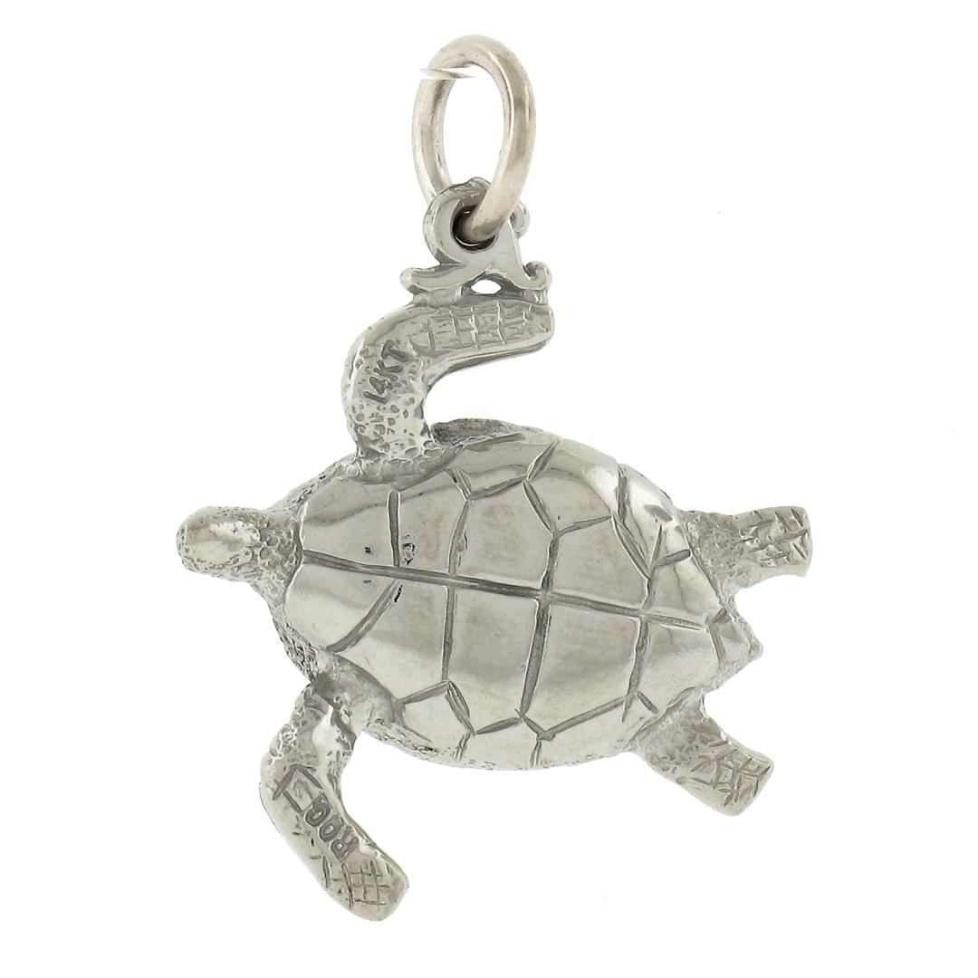 A solid 14k white gold turtle pendant charm. The pendant weighs a total of 2.72 grams, measures 24.6x17.9mm including the bail, and the inside of the bail measures 3.1x4.3mm.