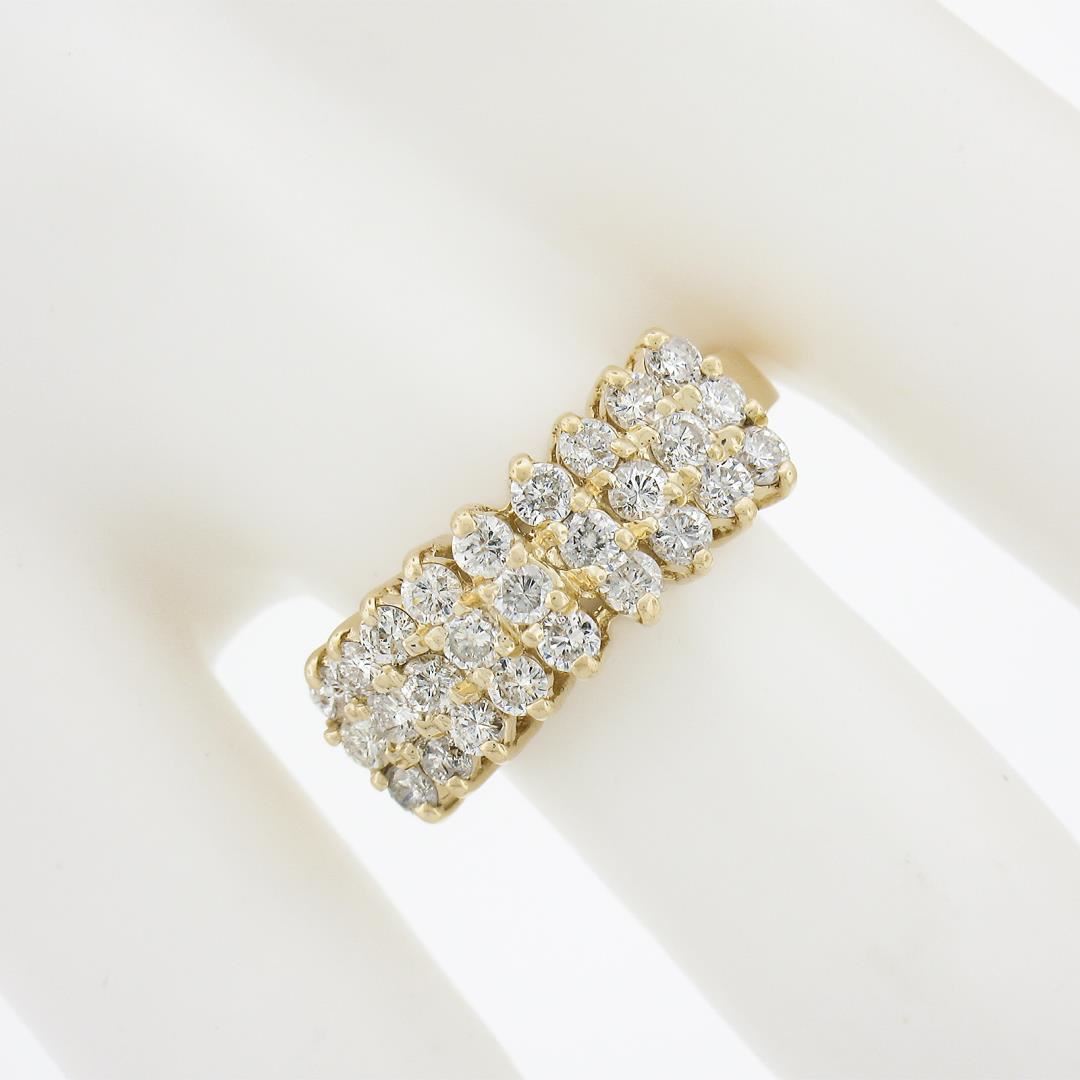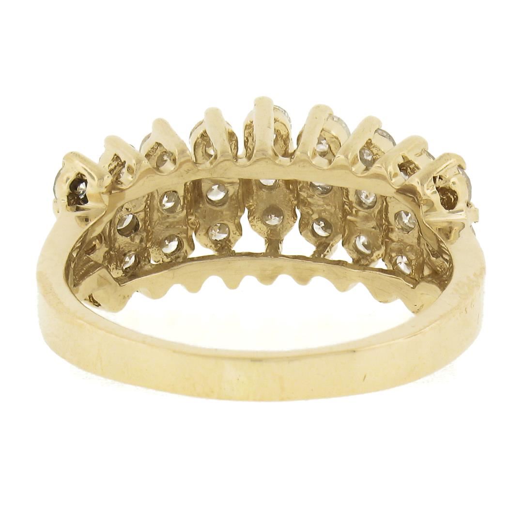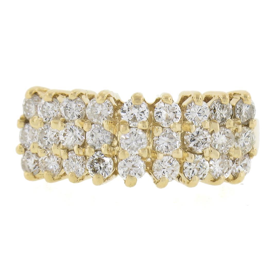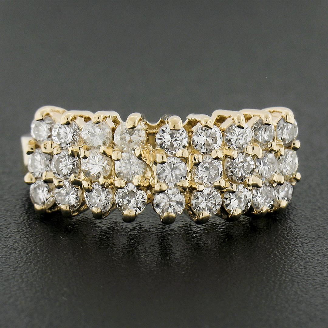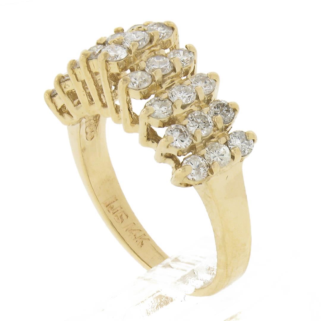 A solid 14k yellow gold pyramid ring, with 27 round cut natural diamonds (G/H - SI1-I2 ; 1.25ctw ). The ring is size 7.0, weighs a total of 4.76 grams, and measures 7.8mm wide.