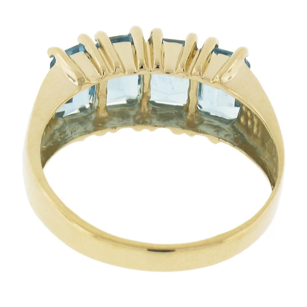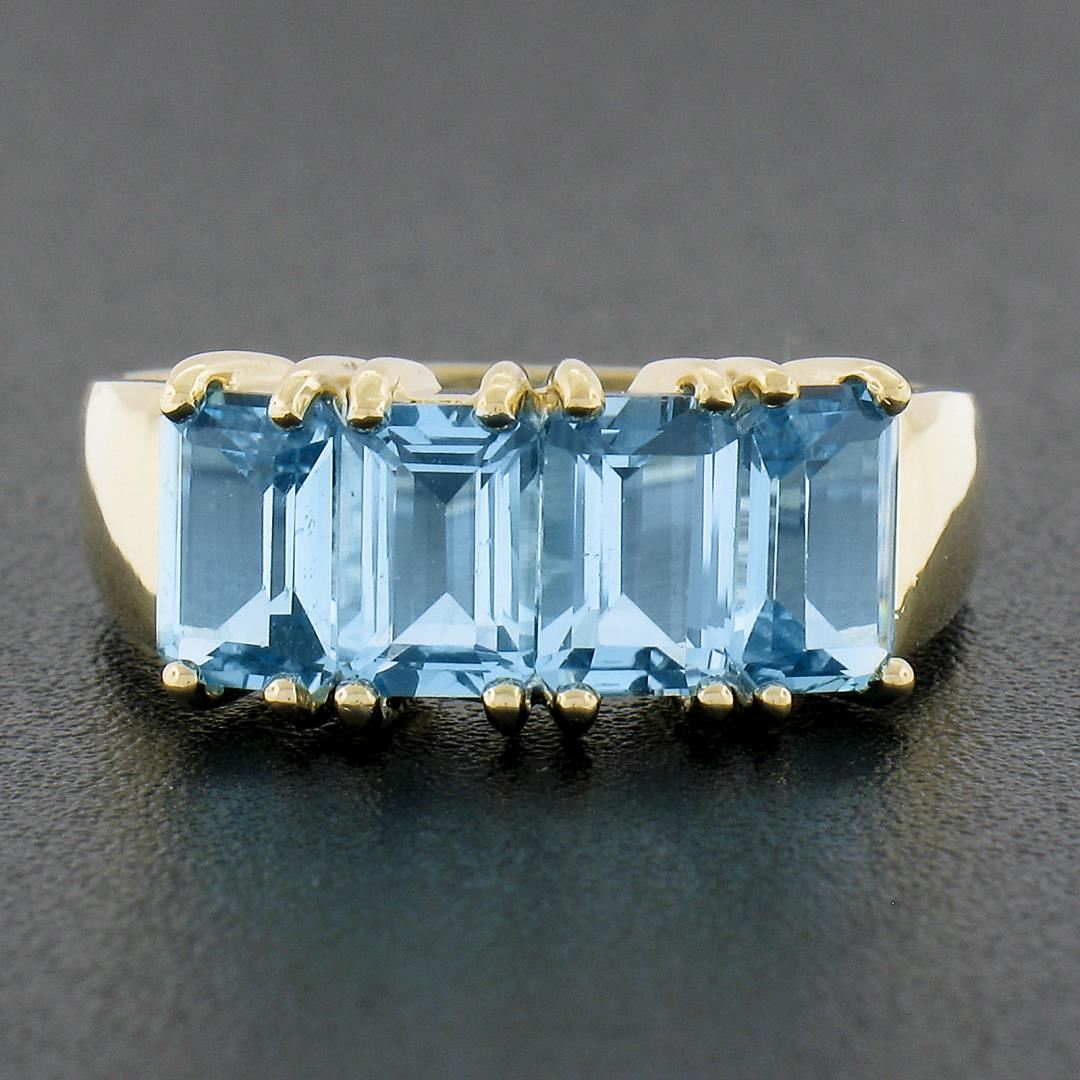A solid 14k yellow gold ring, with 4 emerald cut natural blue topaz (3ctw). The ring is size 6.5, weighs a total of 3.10 grams, and measures 7.6mm wide.