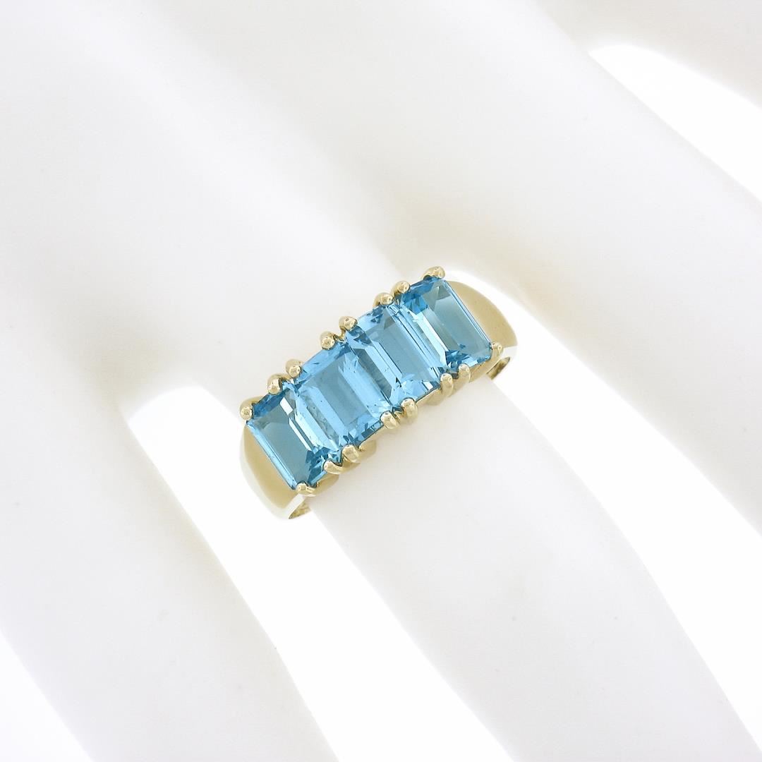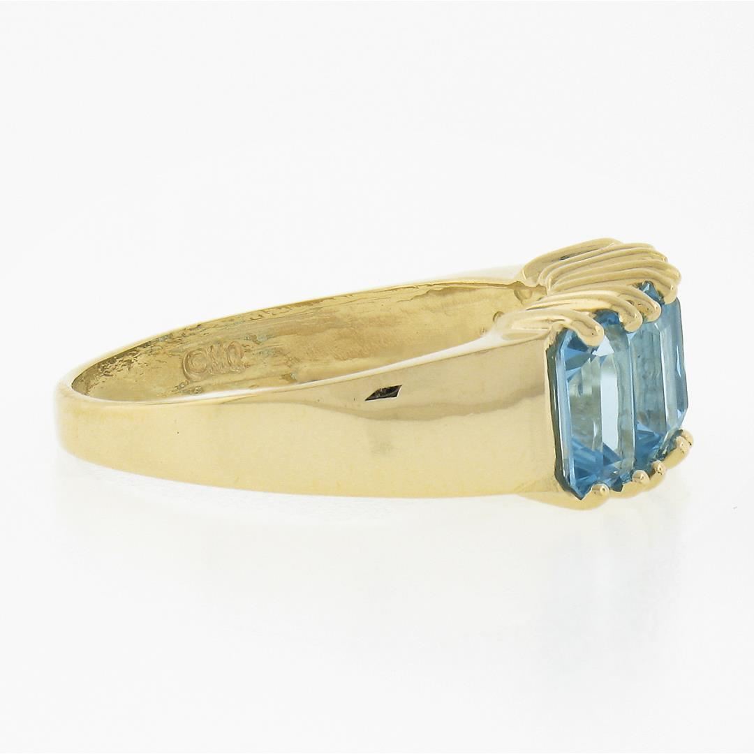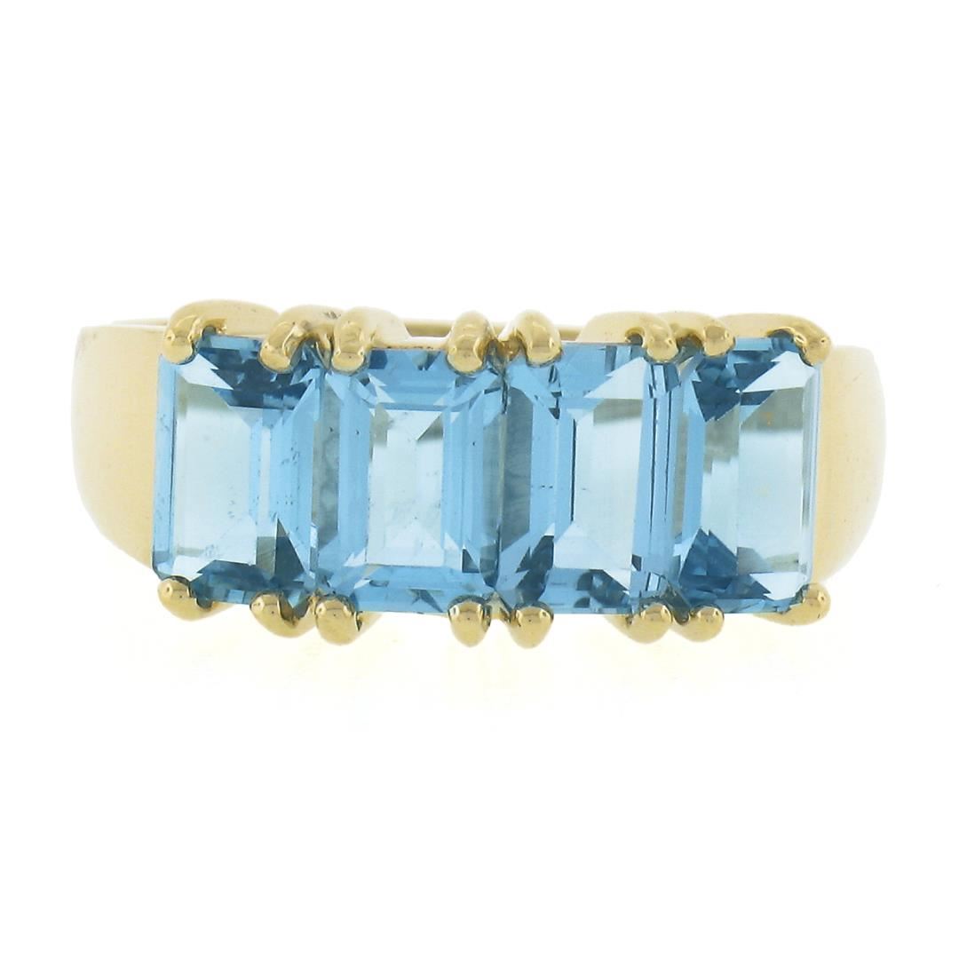 A solid 14k yellow gold ring, with 4 emerald cut natural blue topaz (3ctw). The ring is size 6.5, weighs a total of 3.10 grams, and measures 7.6mm wide.