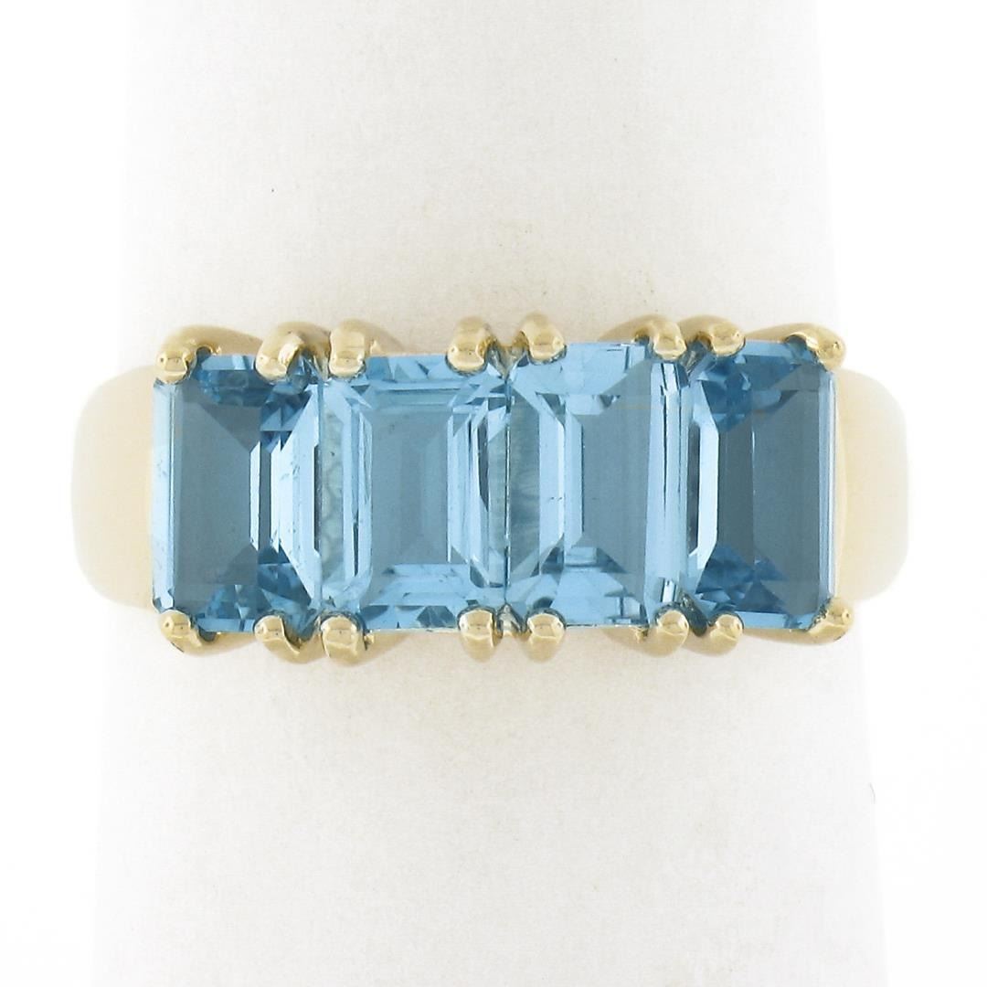 A solid 14k yellow gold ring, with 4 emerald cut natural blue topaz (3ctw). The ring is size 6.5, weighs a total of 3.10 grams, and measures 7.6mm wide.