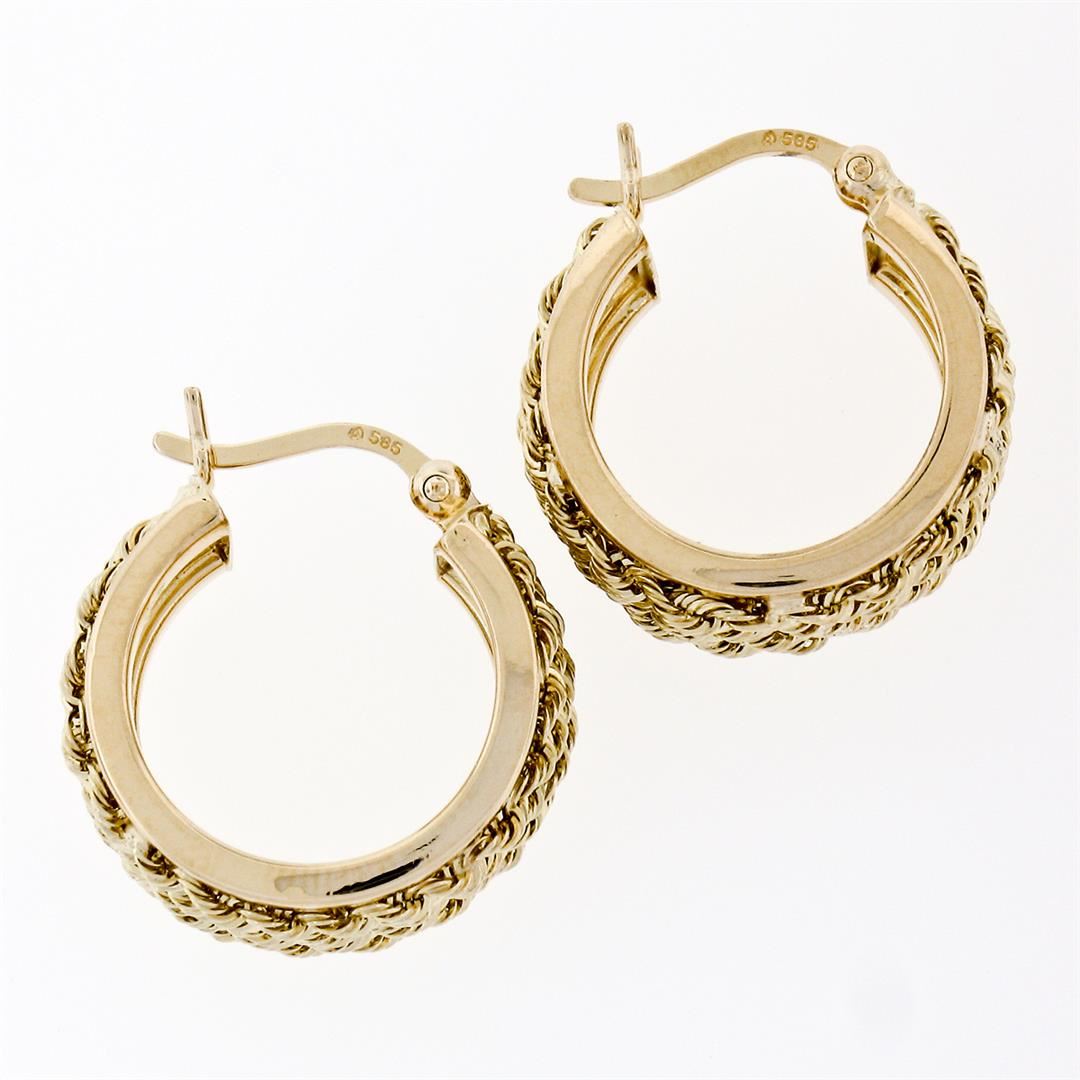 A pair of new solid 14k yellow gold hoop earrings, centered with 4 row of rope chain. The earrings measure approximately 18.0x8.55mm and weigh a total of 5.70 grams.