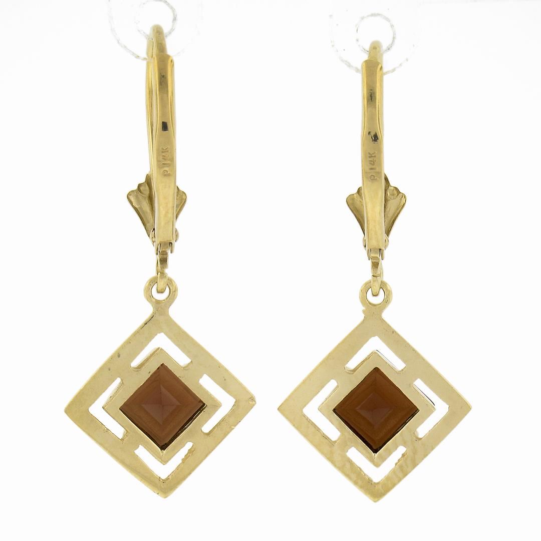 A solid 14k yellow gold dangle earrings, with 2 square cut natrual garnets (5x5.1mm). The earrings measure approximately 27.9x12.1mm and weigh a total of 2.43 grams.