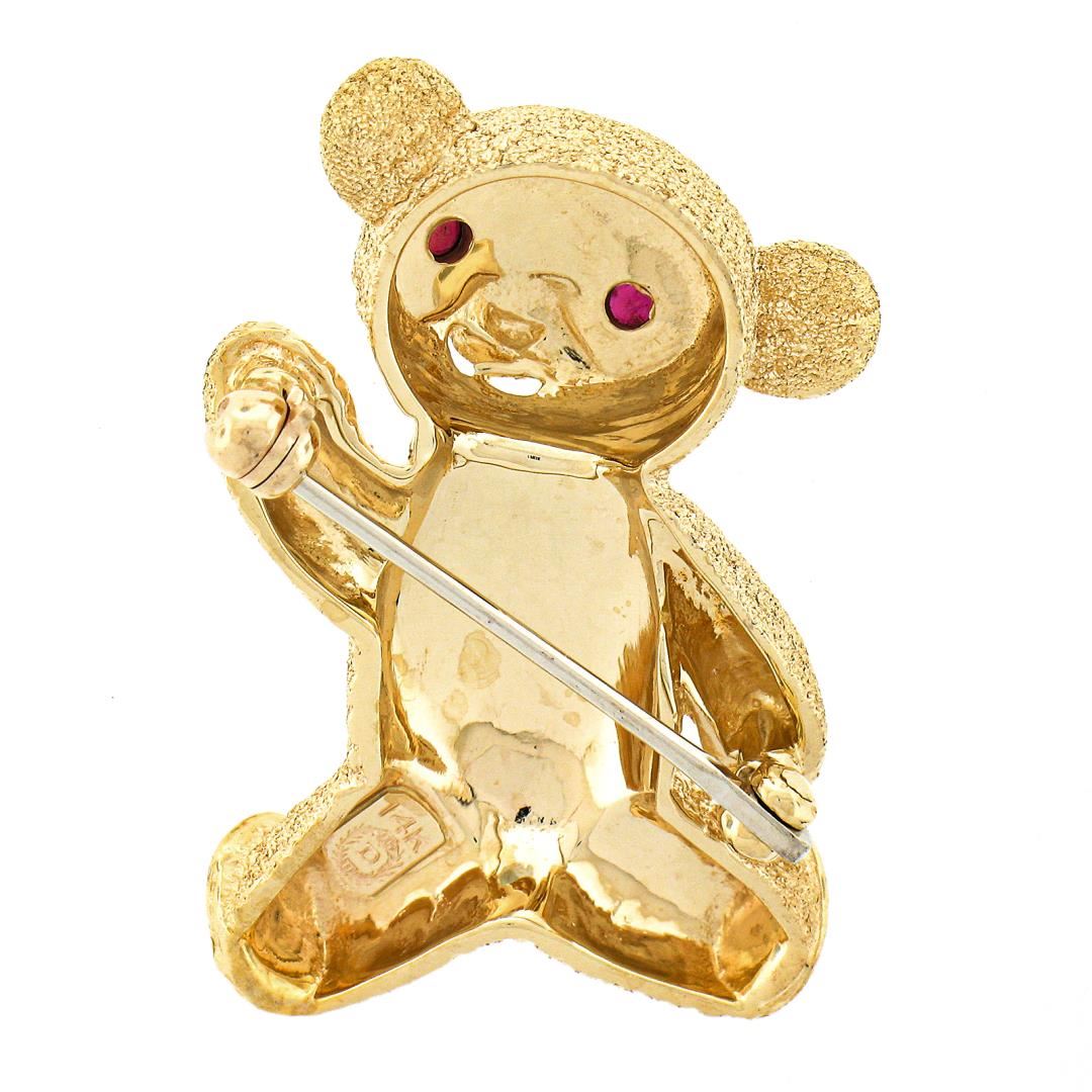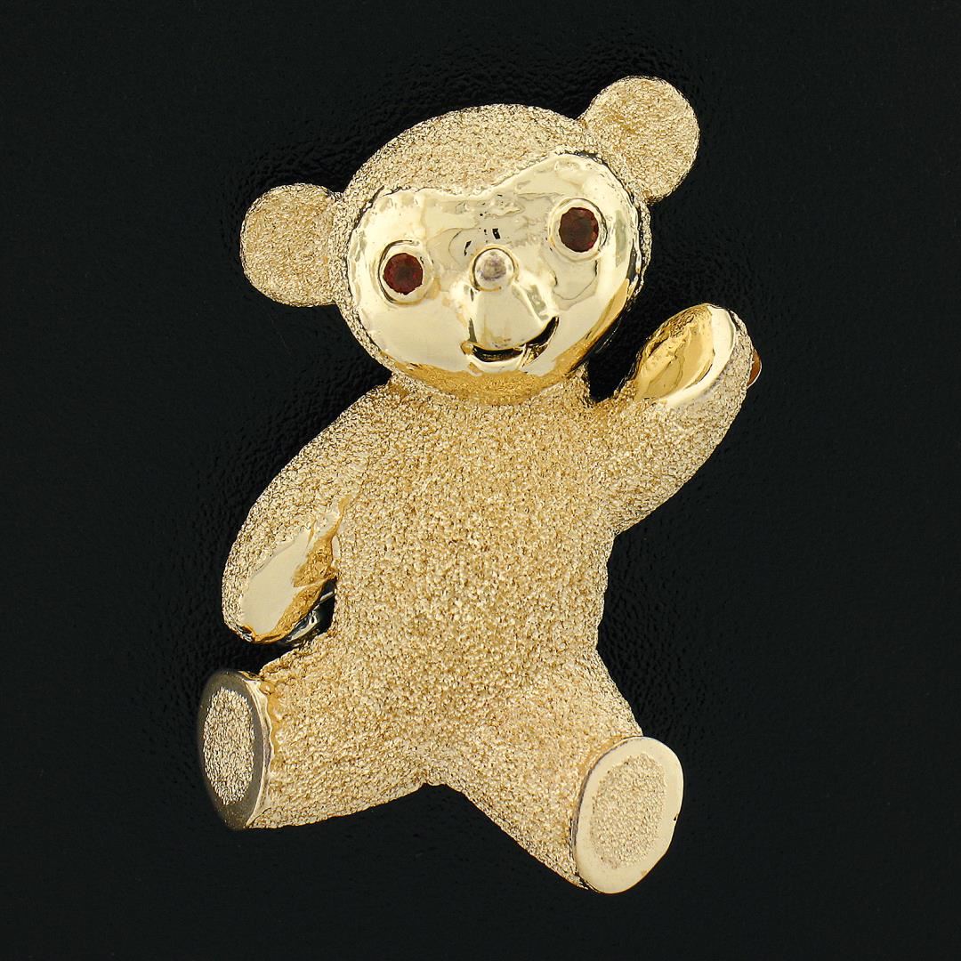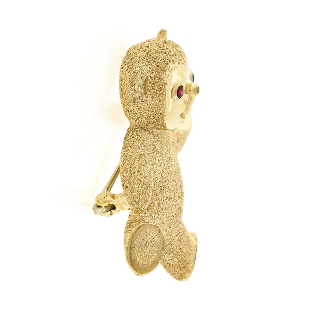 A solid 14k yellow gold bear brooch, with 2 round brilliant cut natural rubies (0.04ctw). Measures 32.10x20.70mm and weighs a total of 7.74 grams.