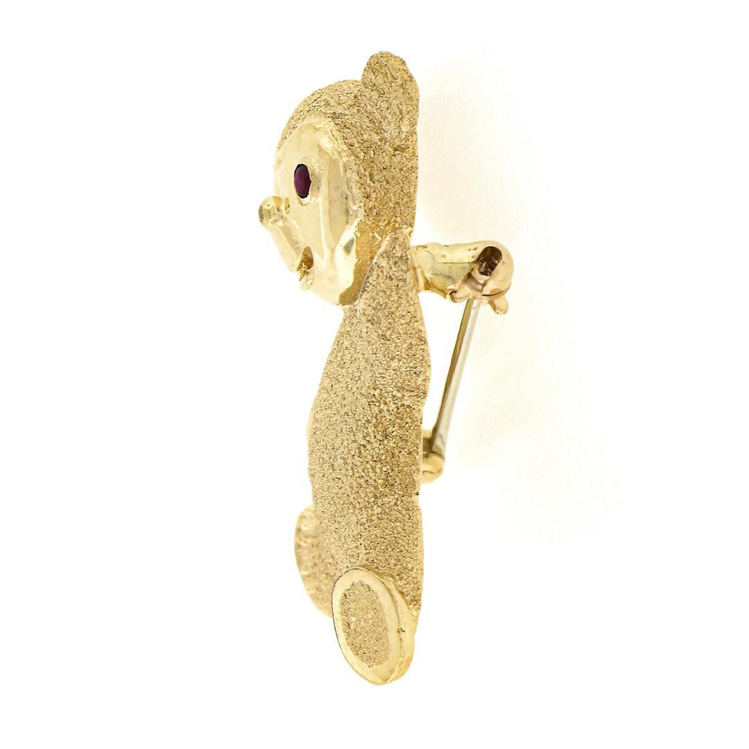 A solid 14k yellow gold bear brooch, with 2 round brilliant cut natural rubies (0.04ctw). Measures 32.10x20.70mm and weighs a total of 7.74 grams.