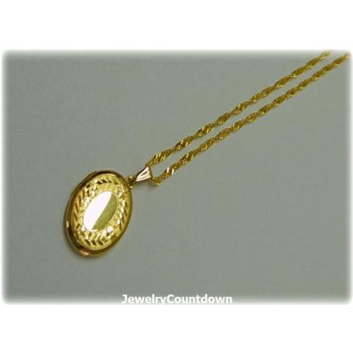 The exquisite locket that is strung on this necklace is large enough to store two 3/4 x 1/2 inch photos. Made in Italy, it has been hand engraved and the fine workmanship is evident in this piece. Chambers are lined with glass to protect your precious photos. Chain measures 18 inches (20 inch chain is available upon request, at no additional charge. Necklace is made of solid 14 Karat Yellow Gold. <BR><BR>Necklace weight: 8 grams<BR><BR>Materials: Solid 14 Karat Yellow Gold<BR><BR>Chain length: 18 inches (20 inch chain is available upon request, at no additional charge) <BR><BR>Locket Height: (30mm) 1.25 Inch (including bail ring)<BR><BR>Locket Width: (17mm) 5/8 Inch<BR><BR>Country of Origin: Italy<BR><BR> Please note: our merchandise is guaranteed 100% to your satisfaction. If you DON'T LOVE this item, simply return it for a complete refund of your purchase price. BONDED SELLER.<p> * Insurance is included in our Domestic Shipping charges: $6 for first item and $3 for each additional item.