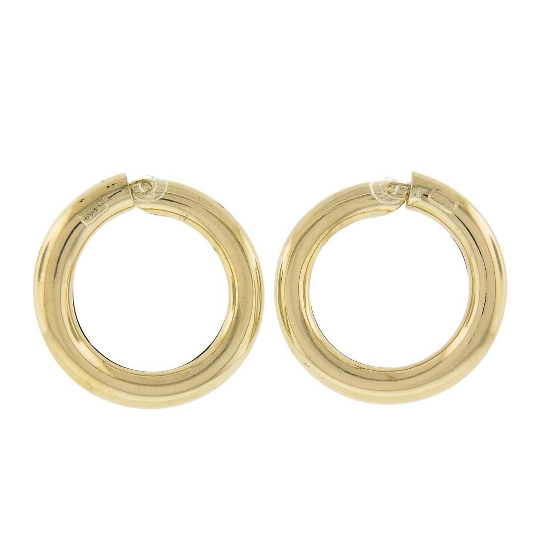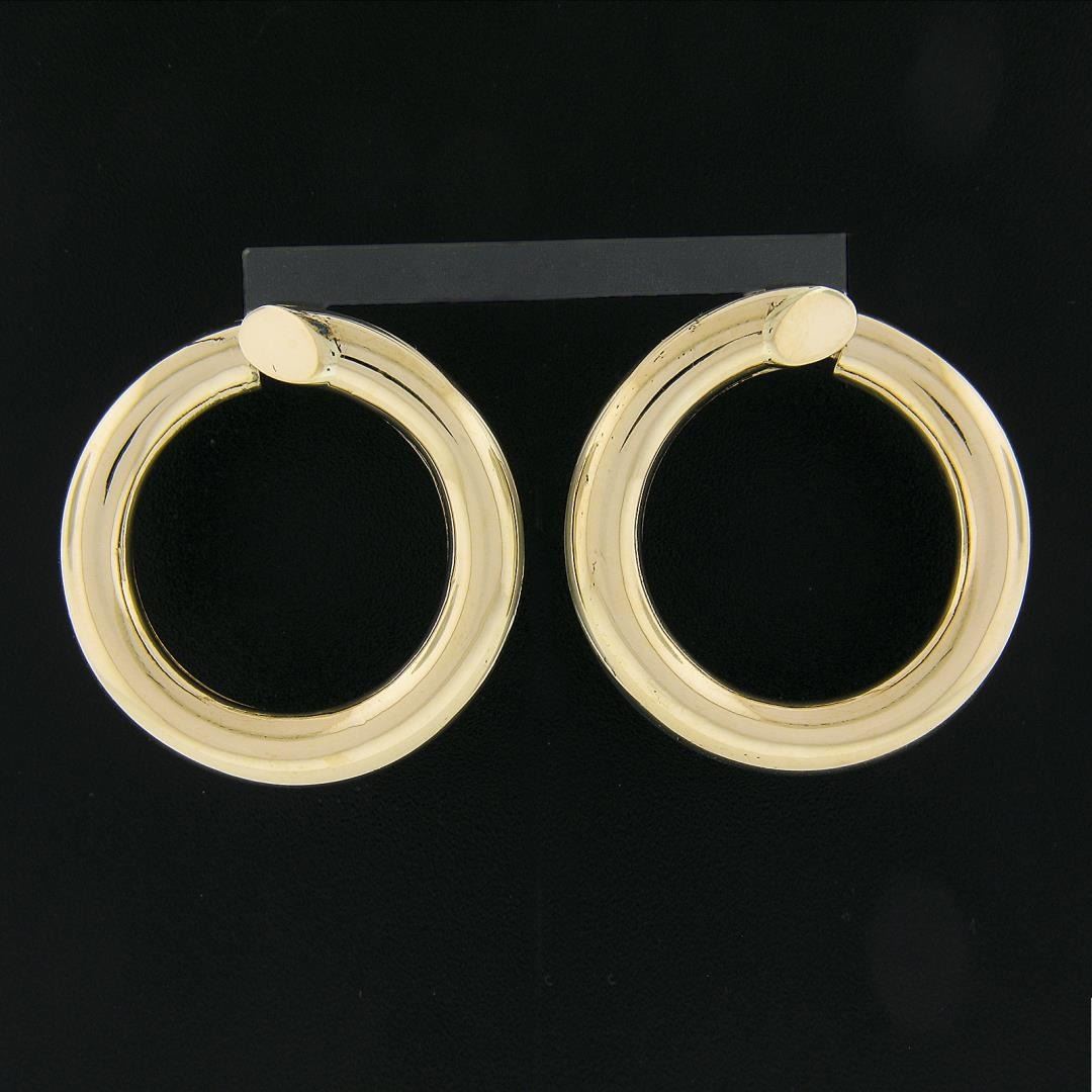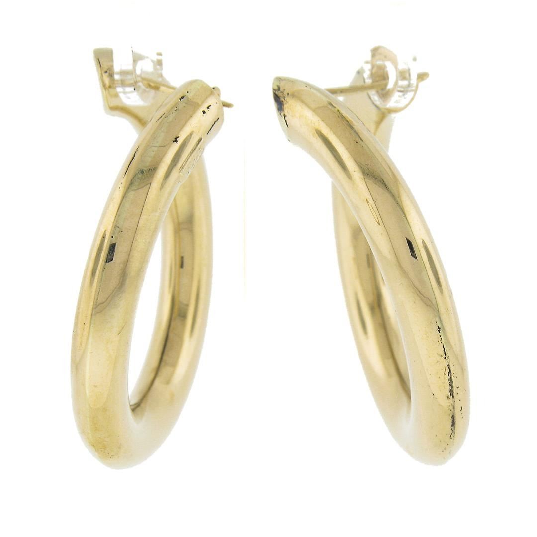 A solid 14k yellow gold hoop earrings. The earrings measure approximately 34mm and weigh a total of 7.15 grams.