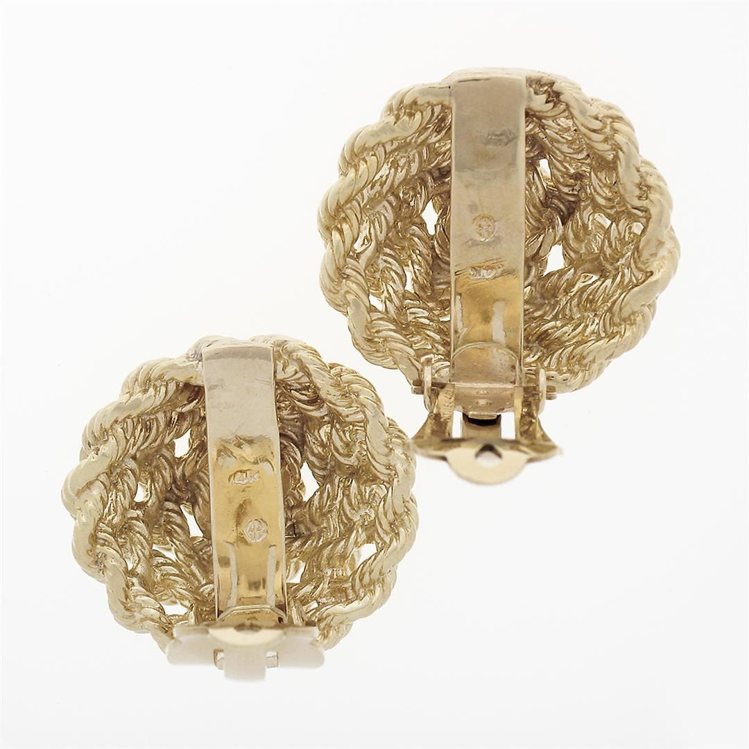 A solid 14k yellow gold rope wrap button clip on pair of earrings. The earrings measure approximately 23mm in diameter and weigh a total of 21.80 grams.