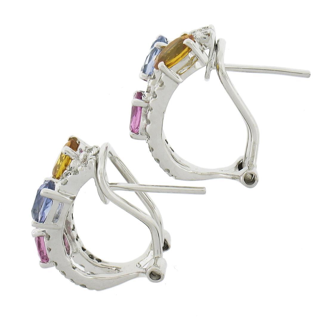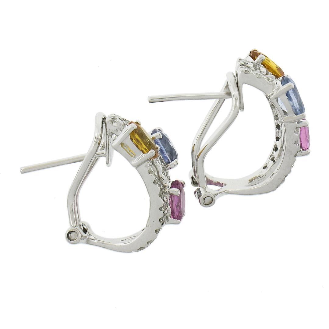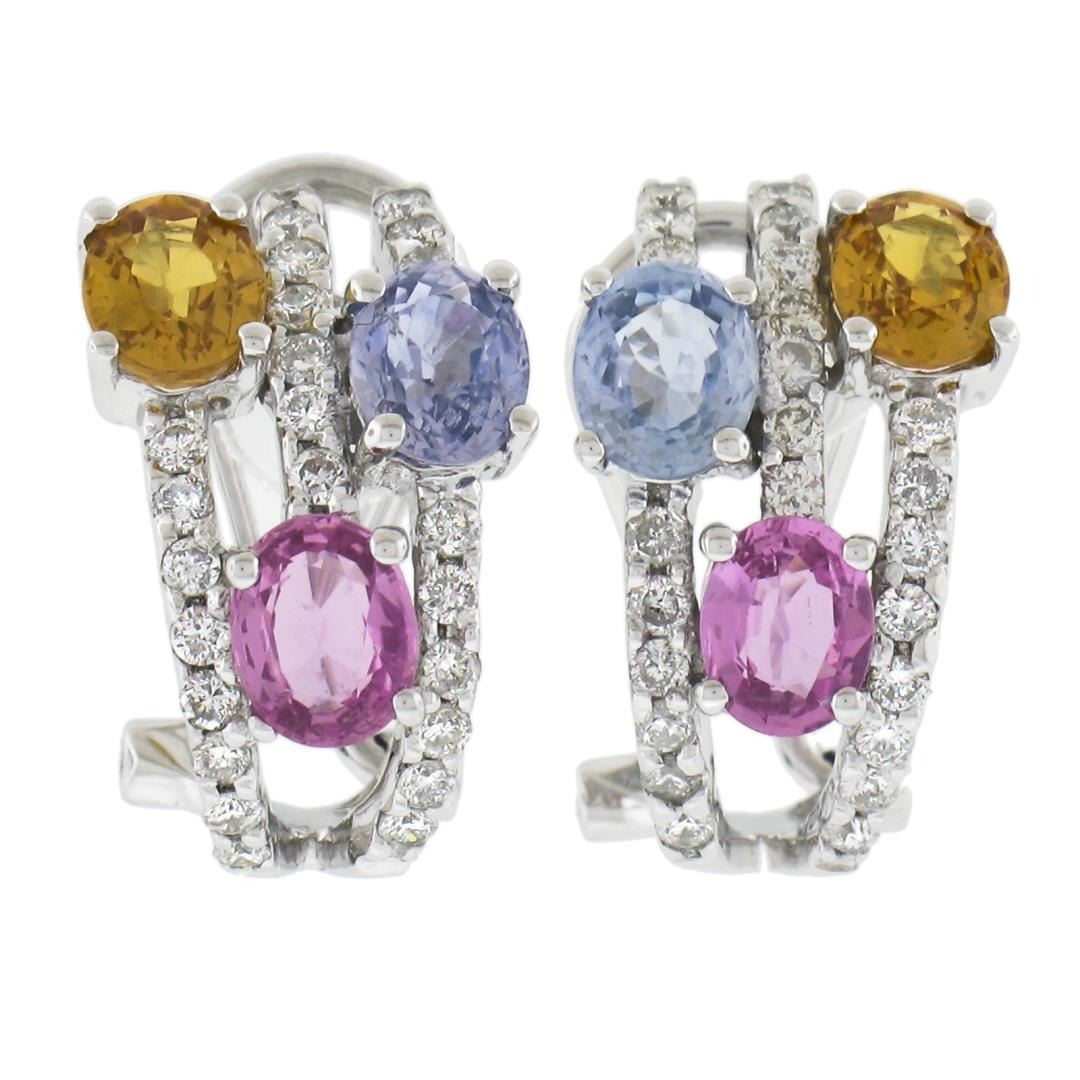 A solid 14k white gold cuff earrings, with 6 oval cut natural sapphires (2-2.50ctw), and 48 round cut natural diamonds (VS2-SI2 ; 0.60ctw). The earrings measure approximately 16x9.8mm and weigh a total of 4.52 grams.
