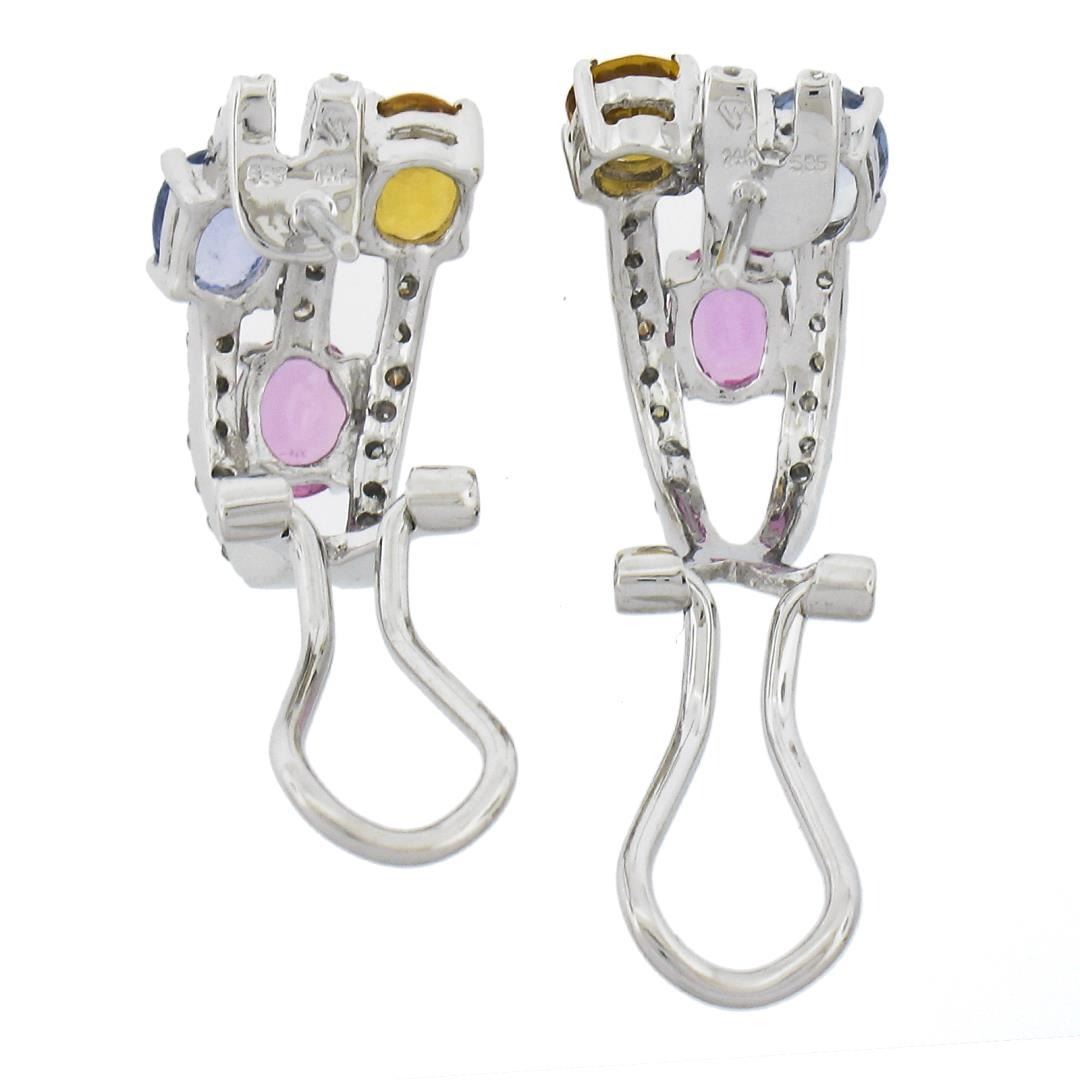 Solid 14k White Gold 3.10 ctw Multi Color Sapphire & Diamond Omega Cuff Earrings