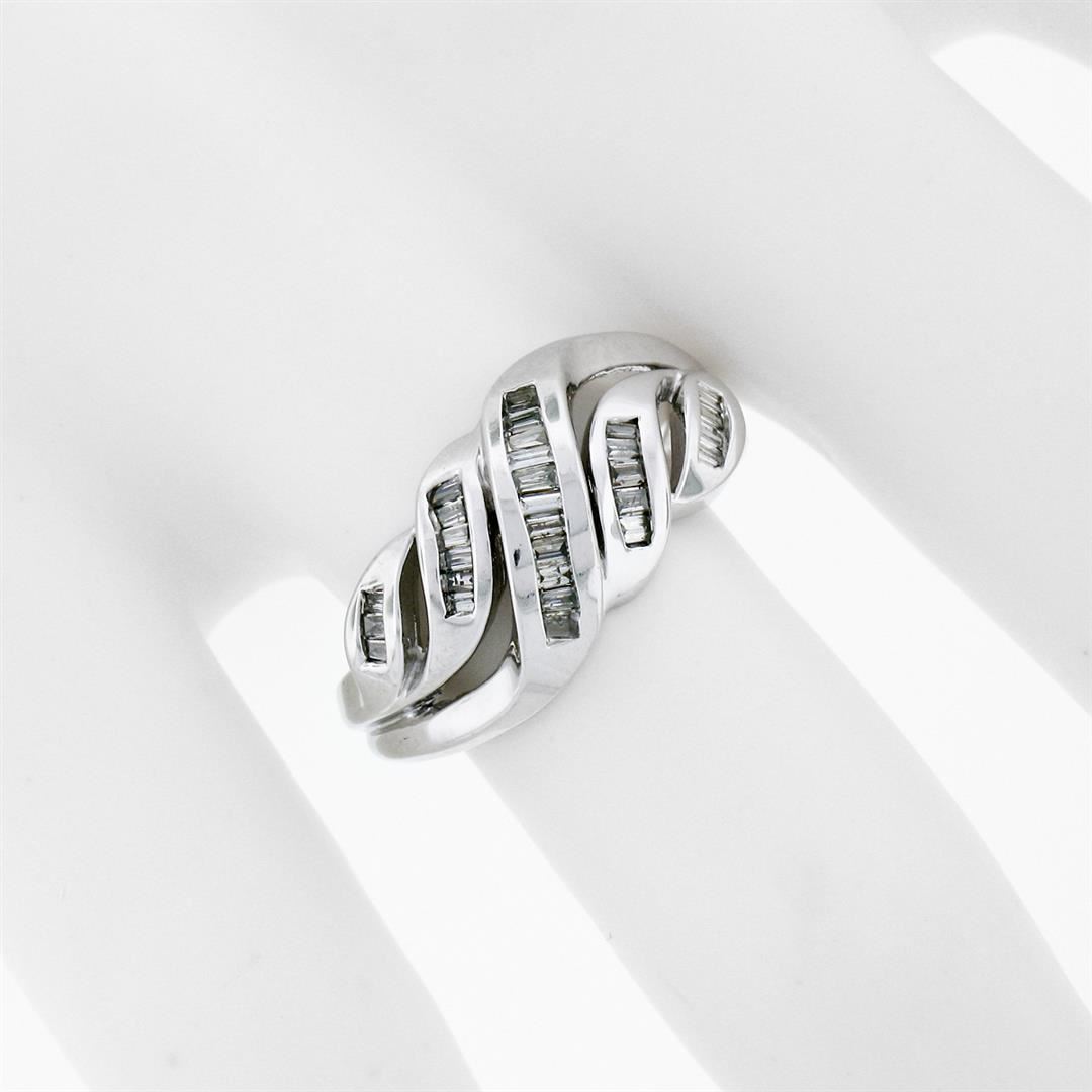 One Solid 14k White Gold .75ct Channel Set Baguette Cut Diamond Open Swirl Band Ring. Item Details: Material: Solid 14k White Gold, Weight: 4.24 Grams, Stone(s): (29) Natural Genuine Diamonds - Baguette Cut - Channel Set - J/K Color - SI2/I1 Clarity, Total Carat Weight: 0.75 (approx.), Ring Size: 6.5 (We can custom size this ring.), Ring Width: 9.50mm at its widest point, Condition: Like New!