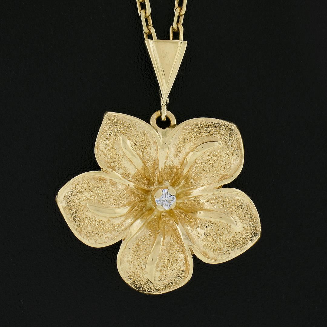 A solid 14k yellow gold flower pendant necklace, with 1 round cut natural diamond (G - VS2 ; 0.04ct). 20 inch beveled cable link chain, 9.60 grams total weight, pendant measures 29.5x24mm.
