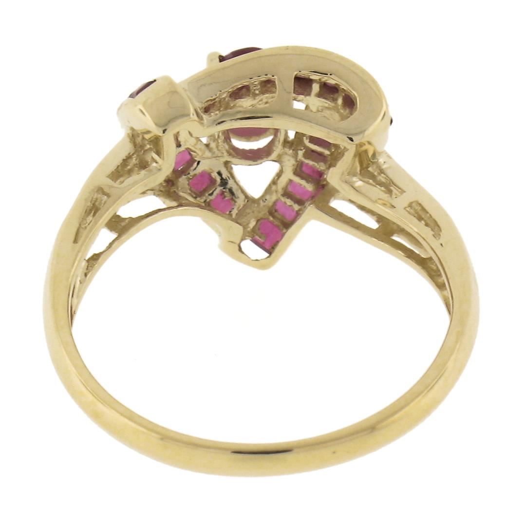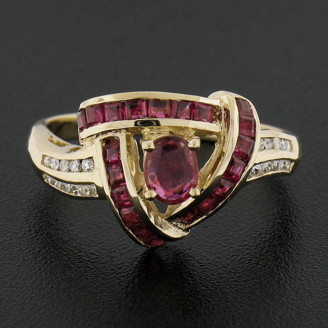 a solid 14k yellow gold knot ring, with 21 oval & square cut natural rubies (0.90ctw), and 20 round cut natural diamonds (G/I - SI1-I1 ; 0.20ctw). The ring is size 7.0, weighs a total of 3.40 grams, and measures 11.4mm wide.