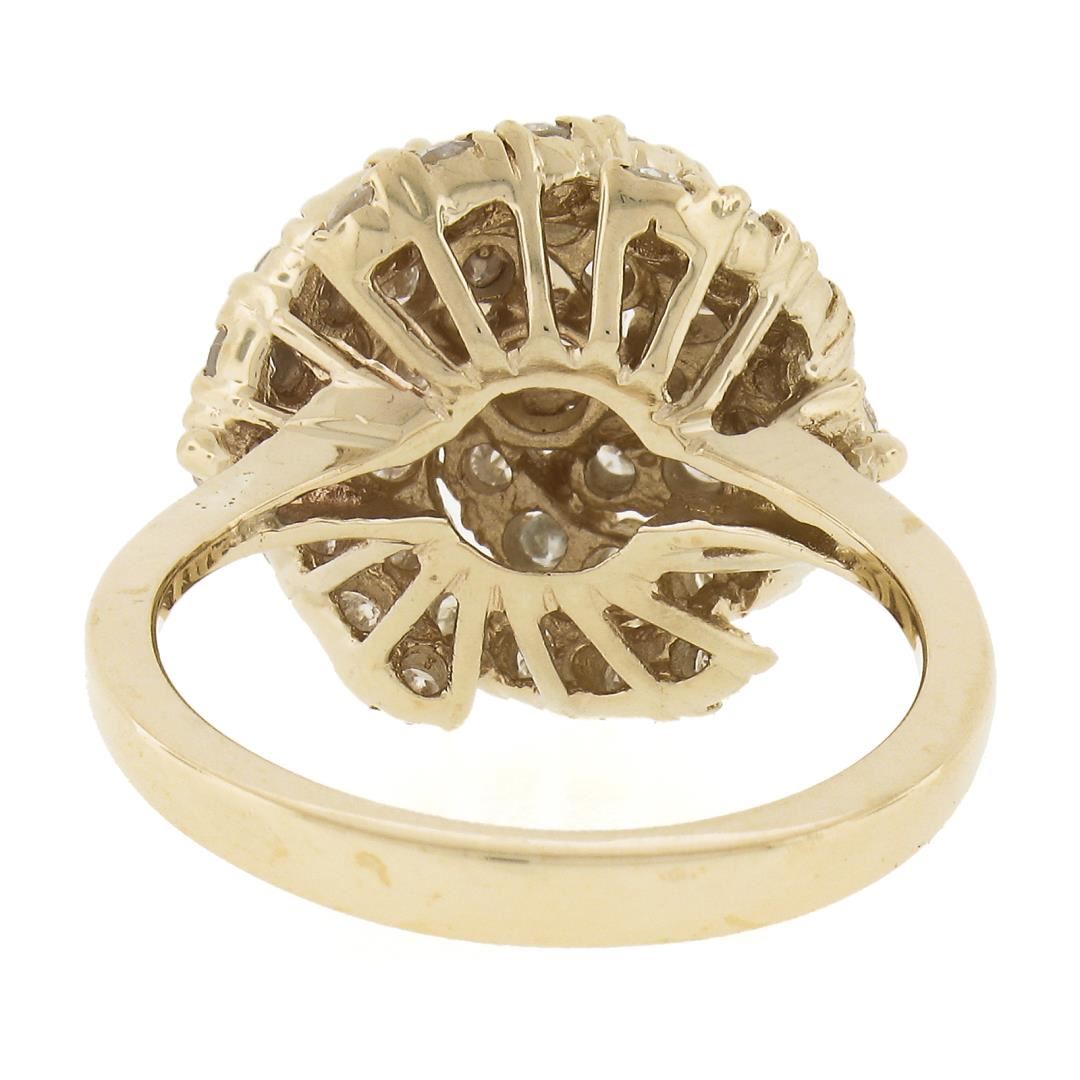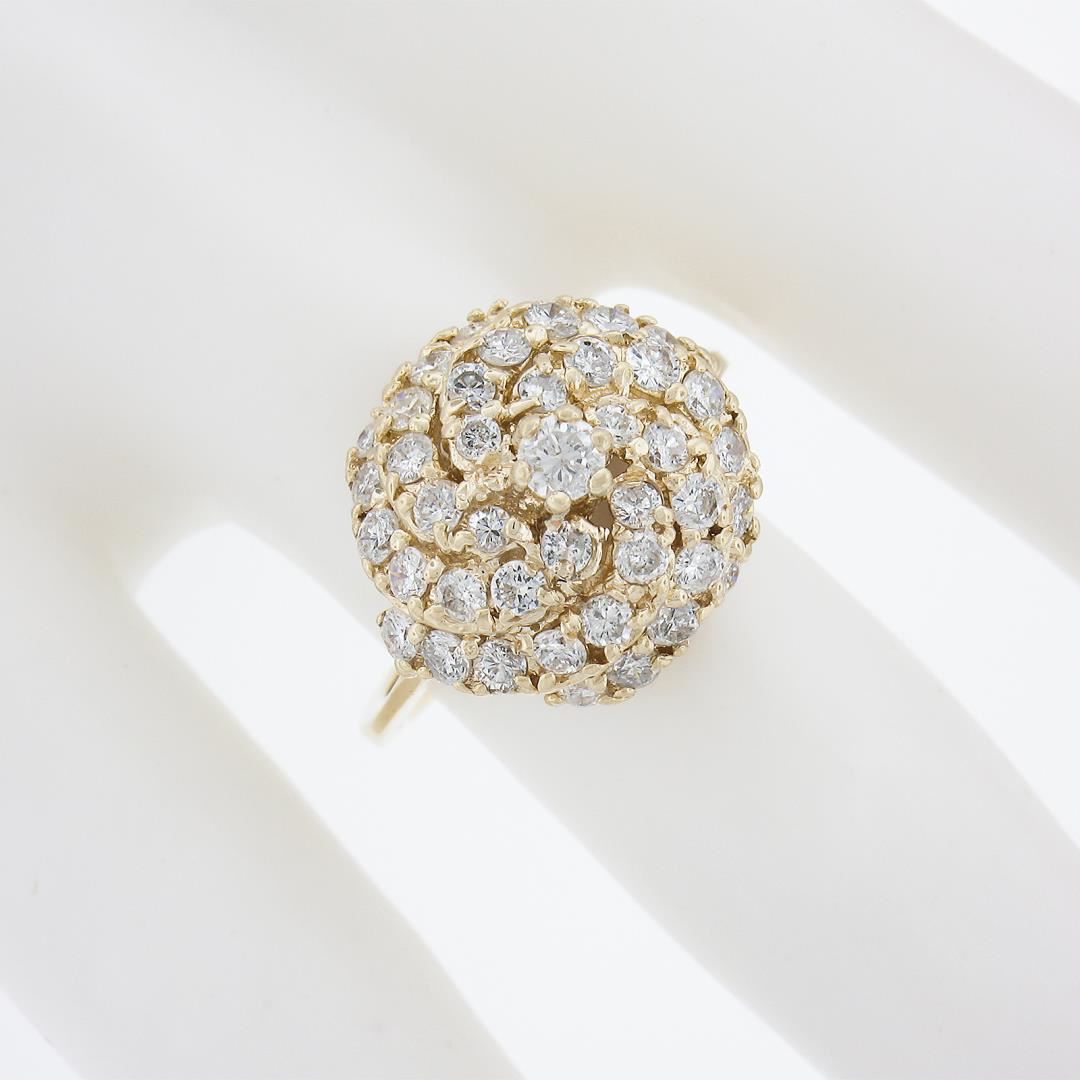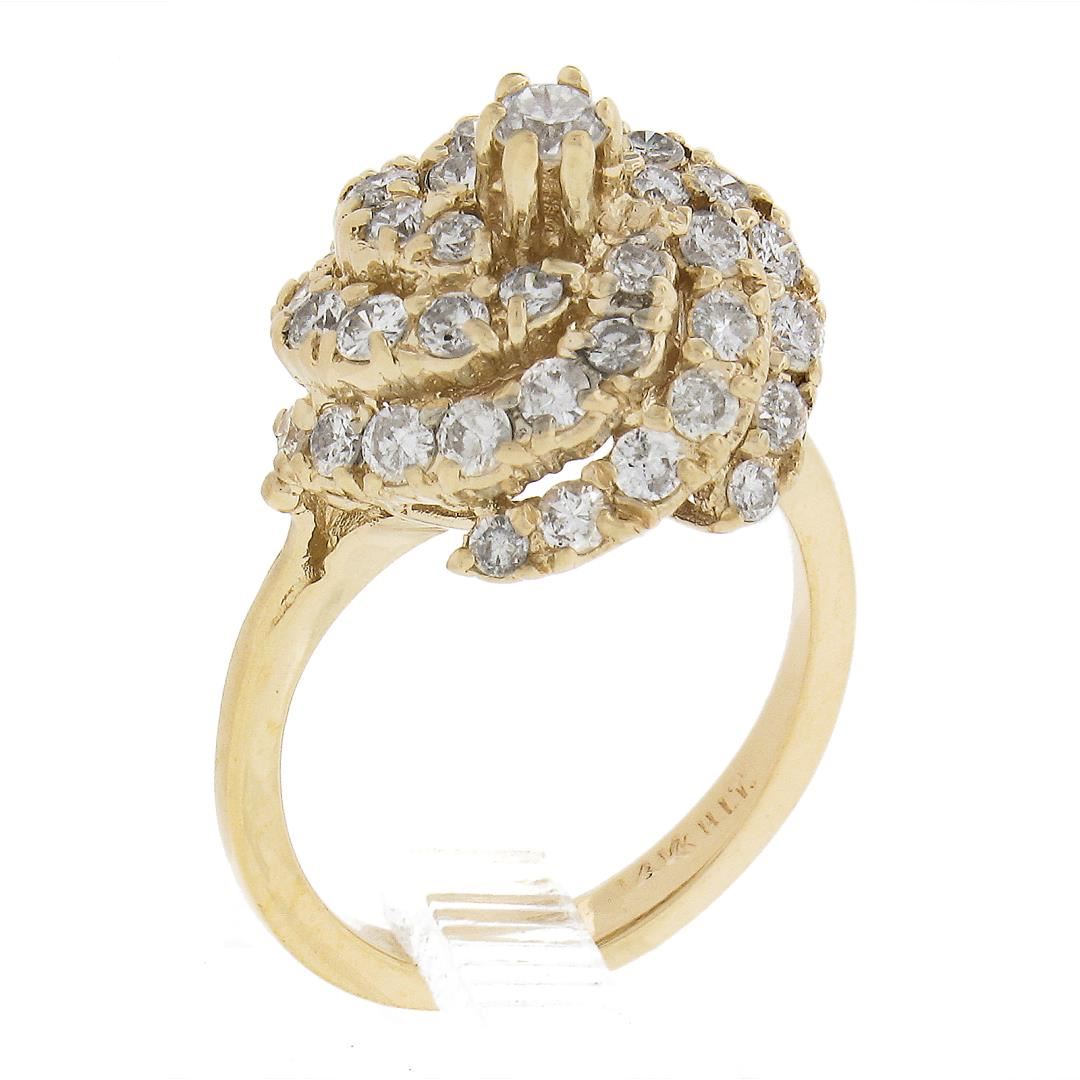 A solid 14k yellow gold swirl ring, with 43 round cut natural diamonds (G-I - SI1-I1 ; 1.55ctw). The ring is size 6.75, weighs a total of 6.25 grams, and measures 14.7mm wide.
