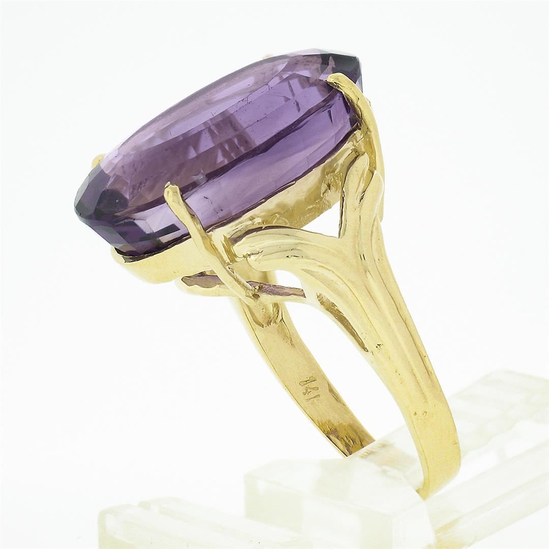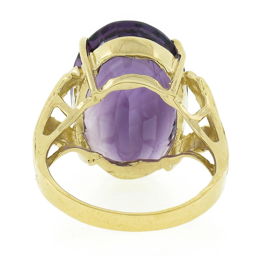 A solid 14k yellow gold solitaire ring, with 1 oval cut natural amethyst (19.5x13.3mm - 15ct).The ring is size 7.5, weighs a total of 7.48 grams, and measures 19.50mm wide.