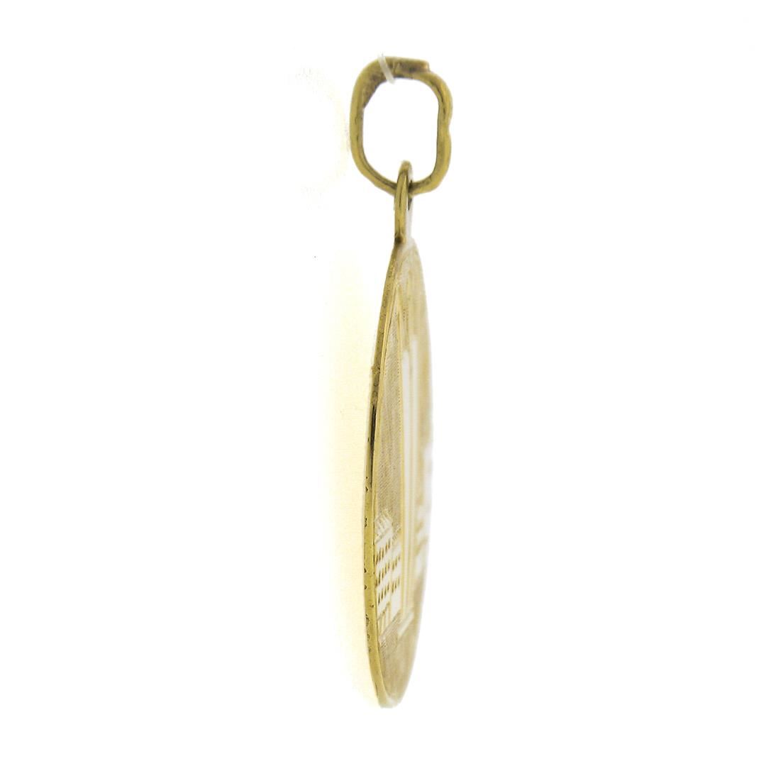 A solid 14k yellow gold towers medallion pendant. The pendant weighs a total of 2.12 grams, measures 27.3x20mm including the bail, and the inside of the bail measures 4.3x3.4mm.