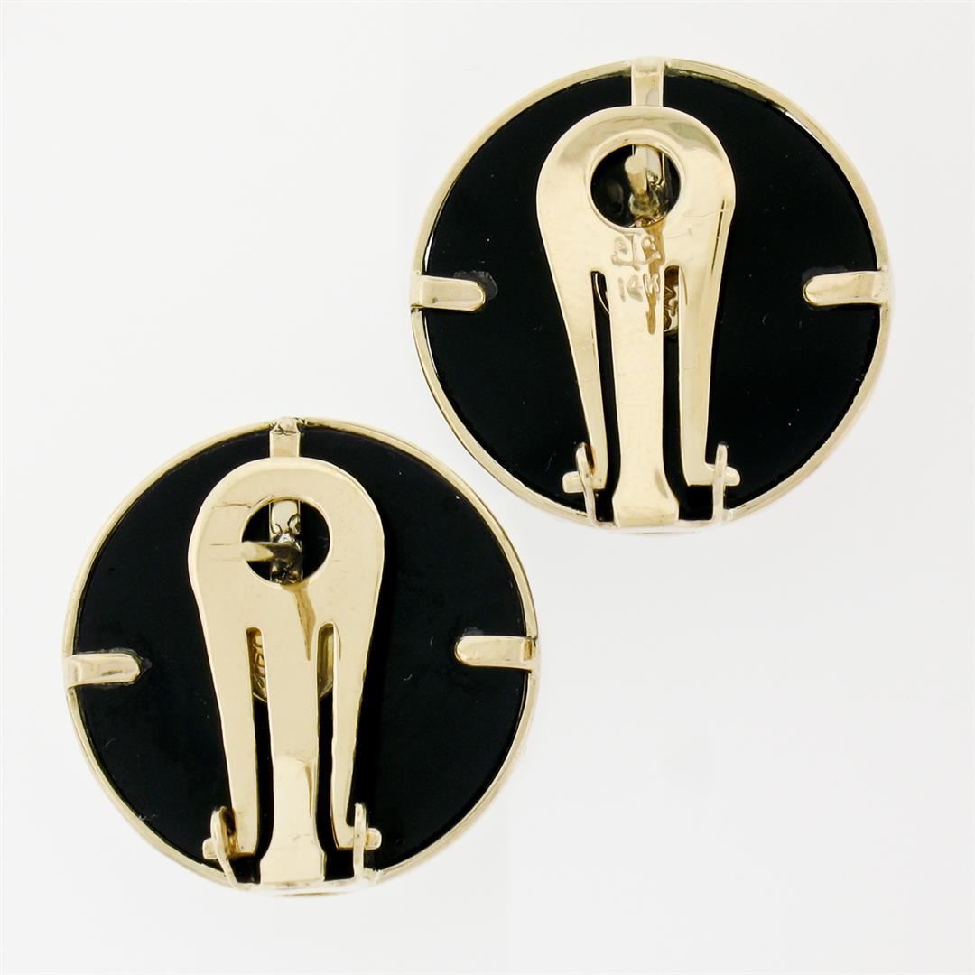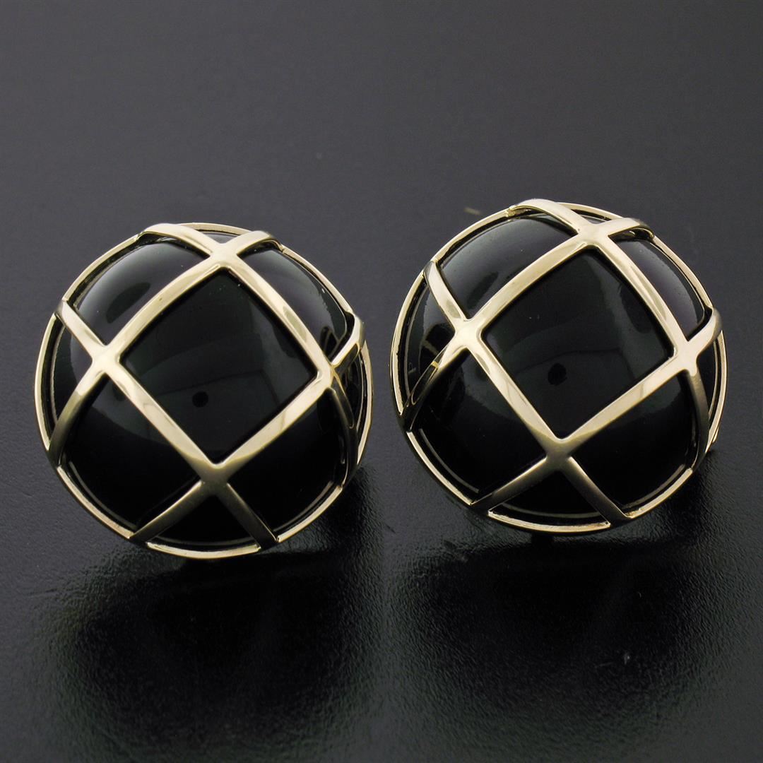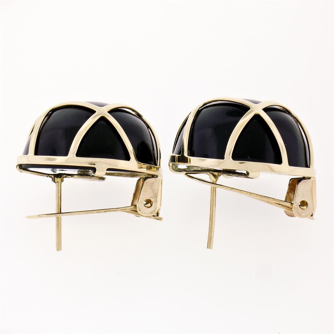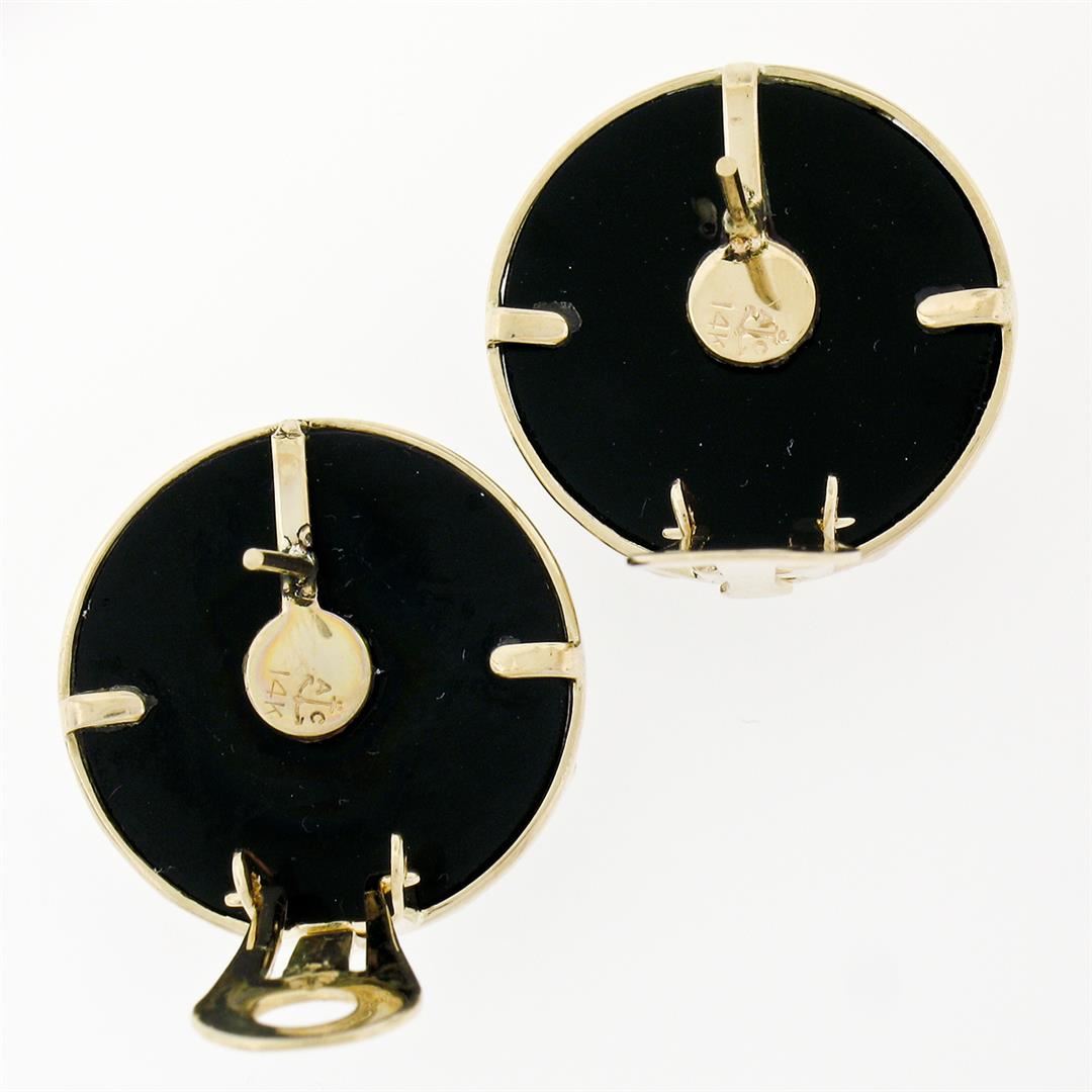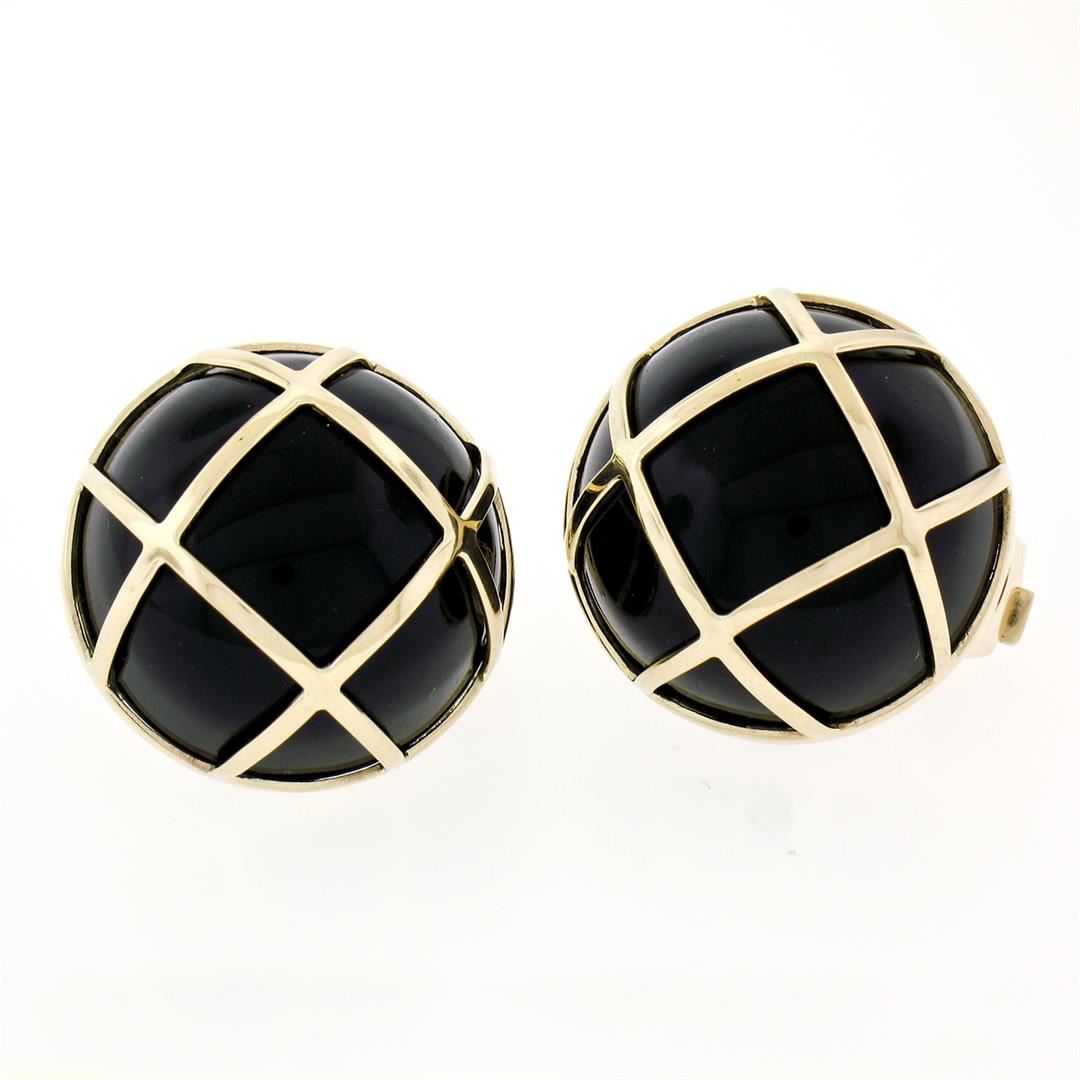 Solid 14k Yellow Gold Large Round Black Onyx Button Earrings & Woven Top Pattern. Please see photos and description for all available information. An estate solid 14k yellow gold button earrings, with 2 round cabochon cut natural black onyx (19.5mm). The earrings measure approximately 21.20mm in diameter and weigh a total of 15.46 grams.