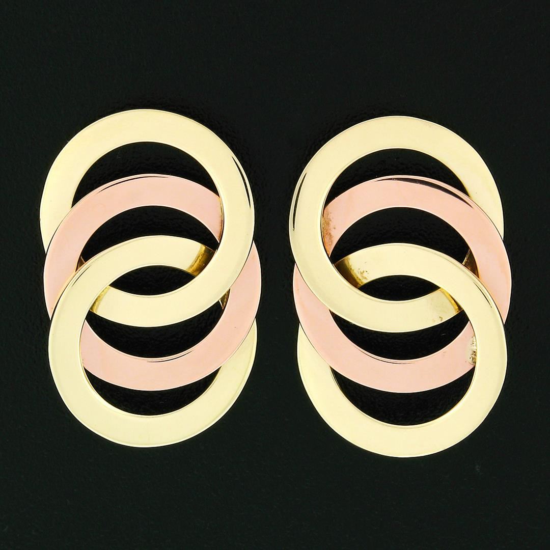 A solid 14k yellow and rose gold triple interlocked circle earrings. The earrings measure approximately 23.44x14.90mm and weigh a total of 4.77 grams.