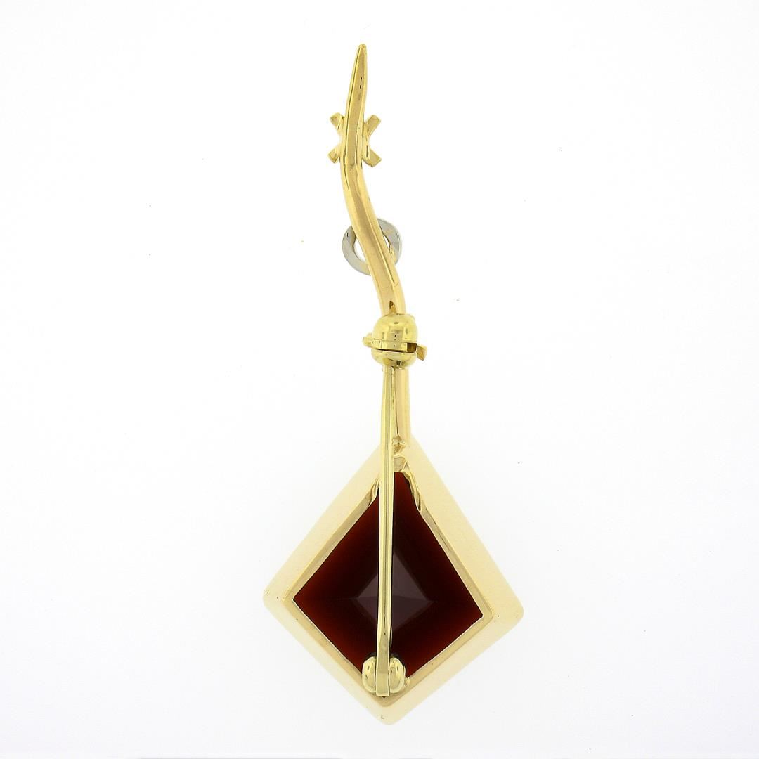 A solid 14k two tone gold kite brooch, with 1 lozenge shape natural garnet (17.3x15.1mm ). Measures 42.20x16.20mm and weighs a total of 5.84 grams.