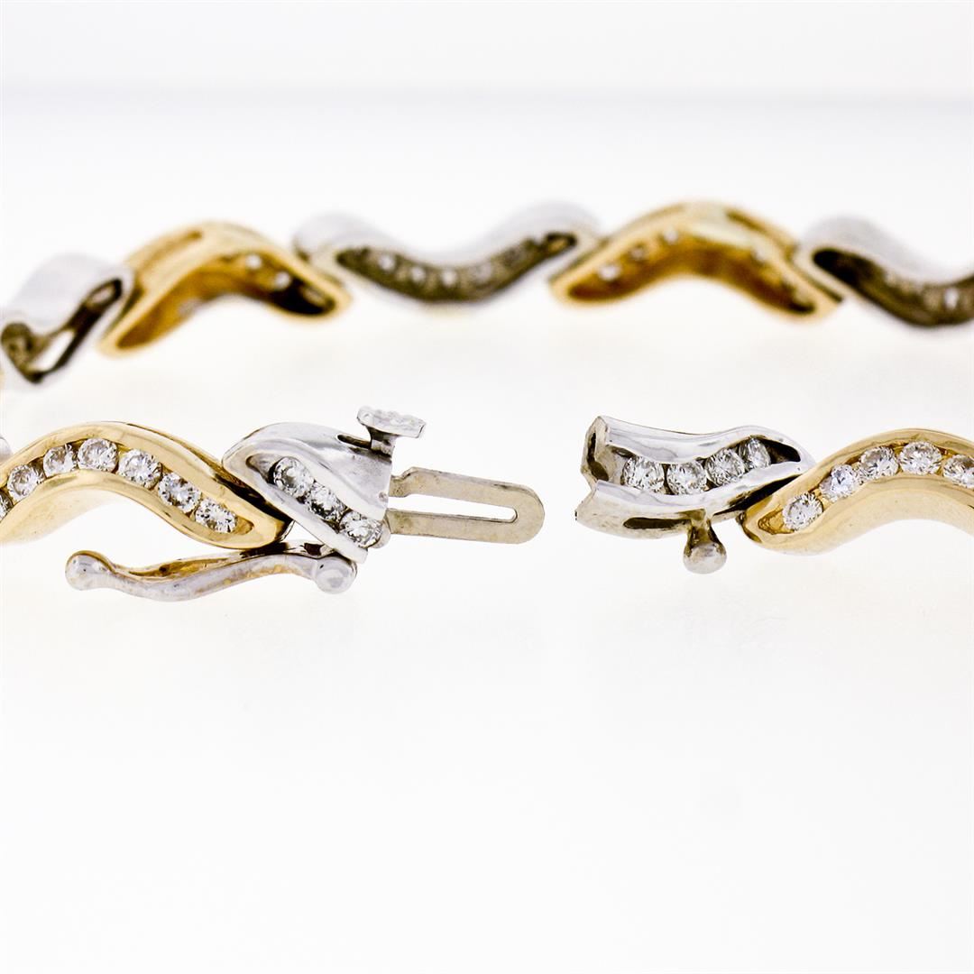 An estate solid 18k yellow and white gold wavy tennis bracelet, with 98 round brilliant cut natural diamonds ( G/H - VS1/VS2; 1.40ctw). It weighs a total of 18.34 grams, measures 5.4mm wide, and measures 7 inches in length.