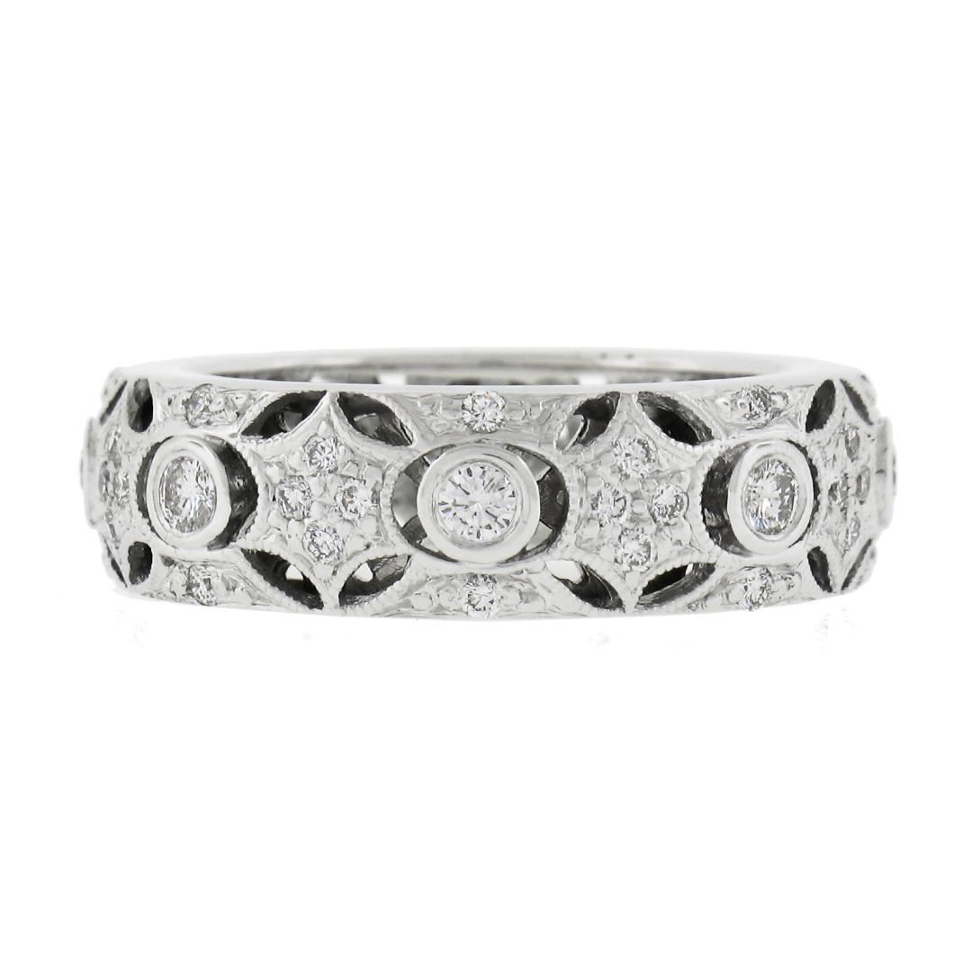 Solid 18K White Gold 0.76ct Star Pave & Bezel Diamond Open Work Wide Band Ring