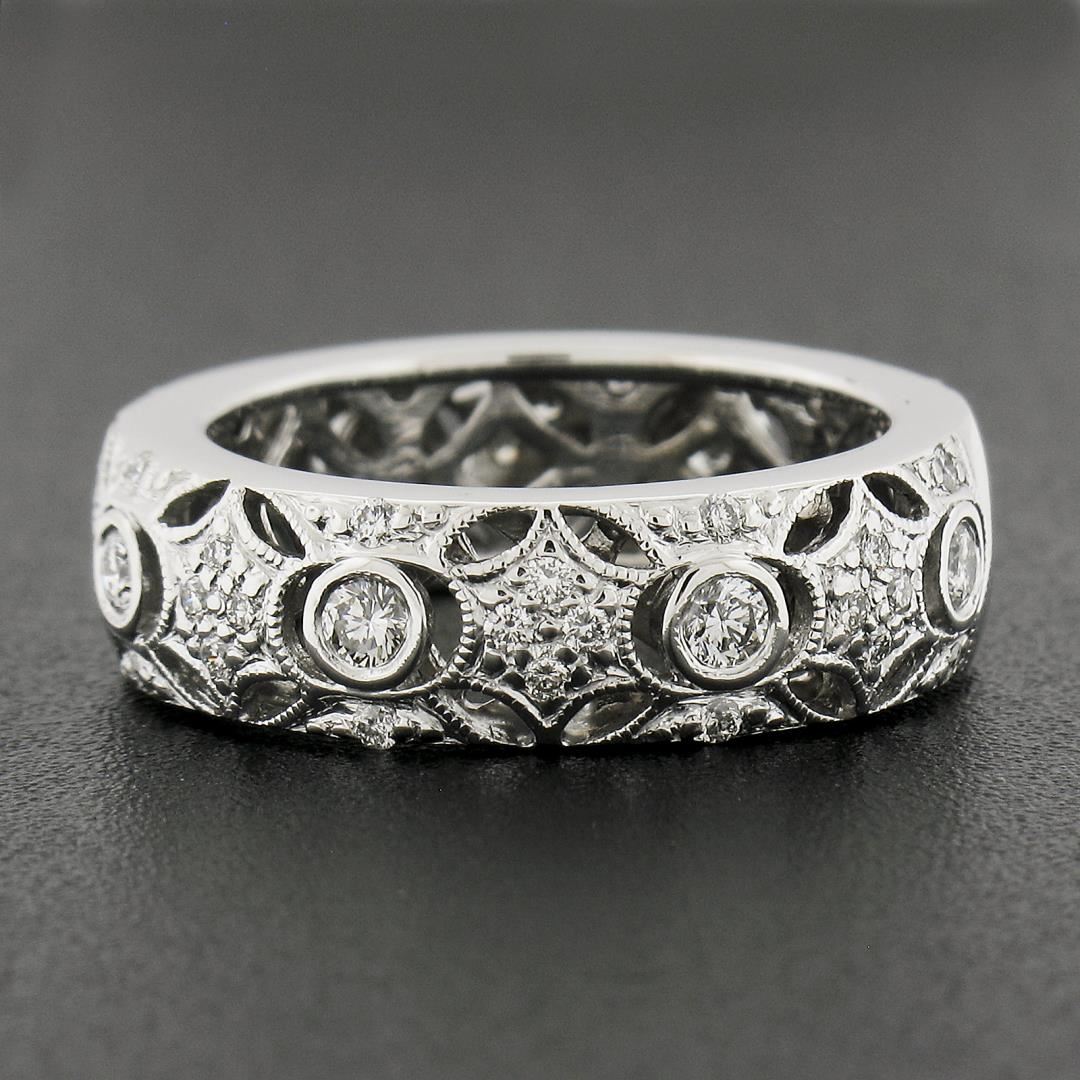 Solid 18K White Gold 0.76ct Star Pave & Bezel Diamond Open Work Wide Band Ring