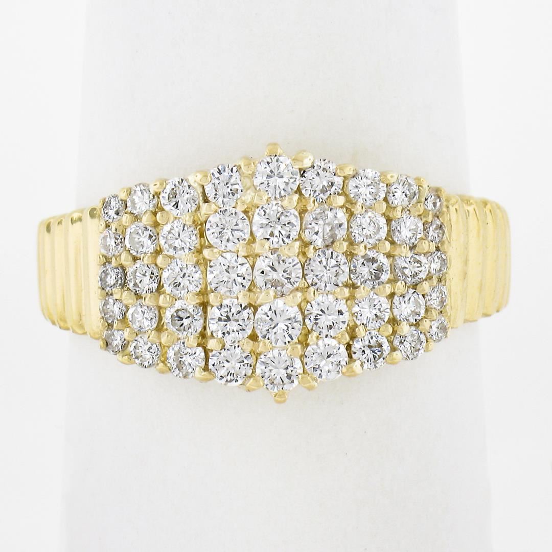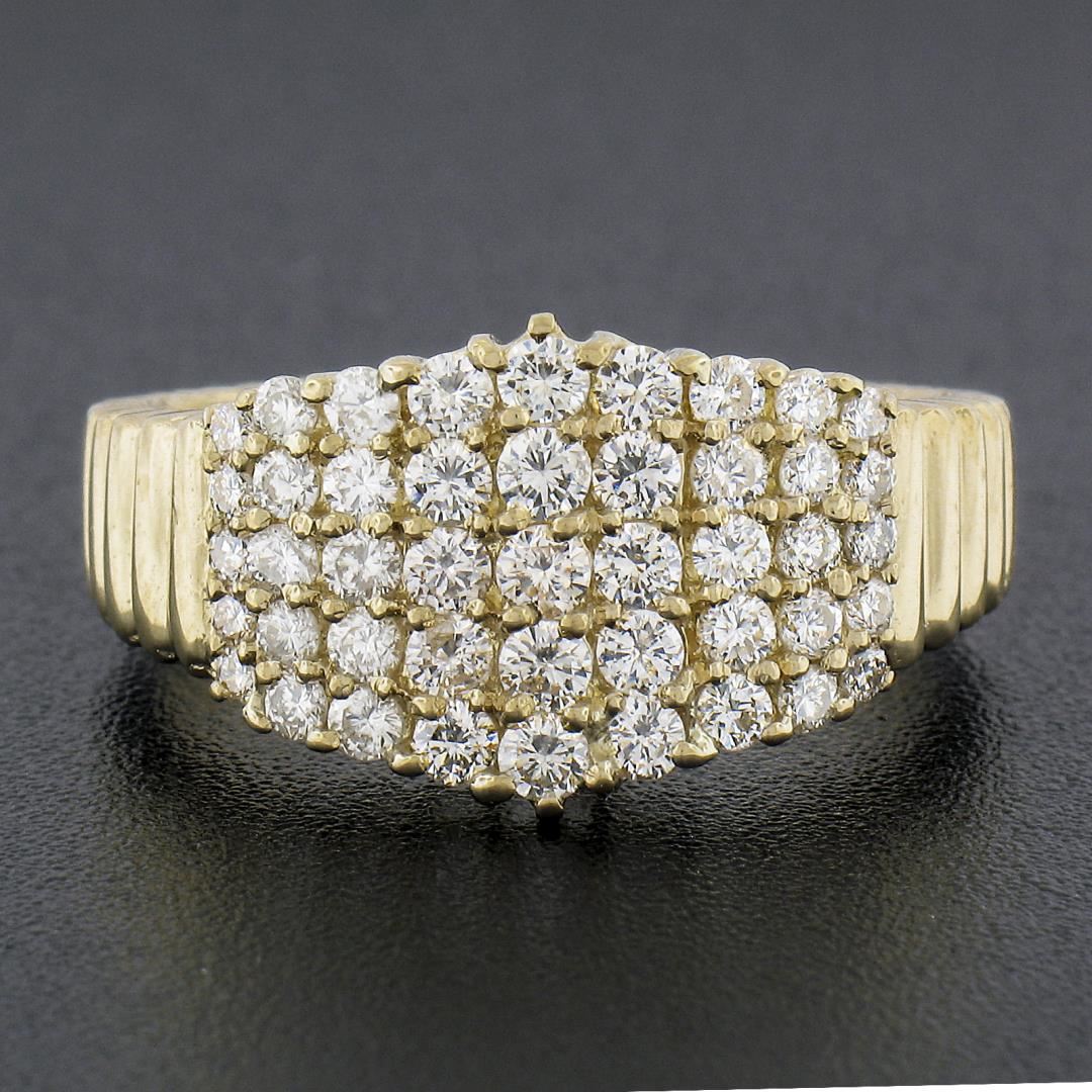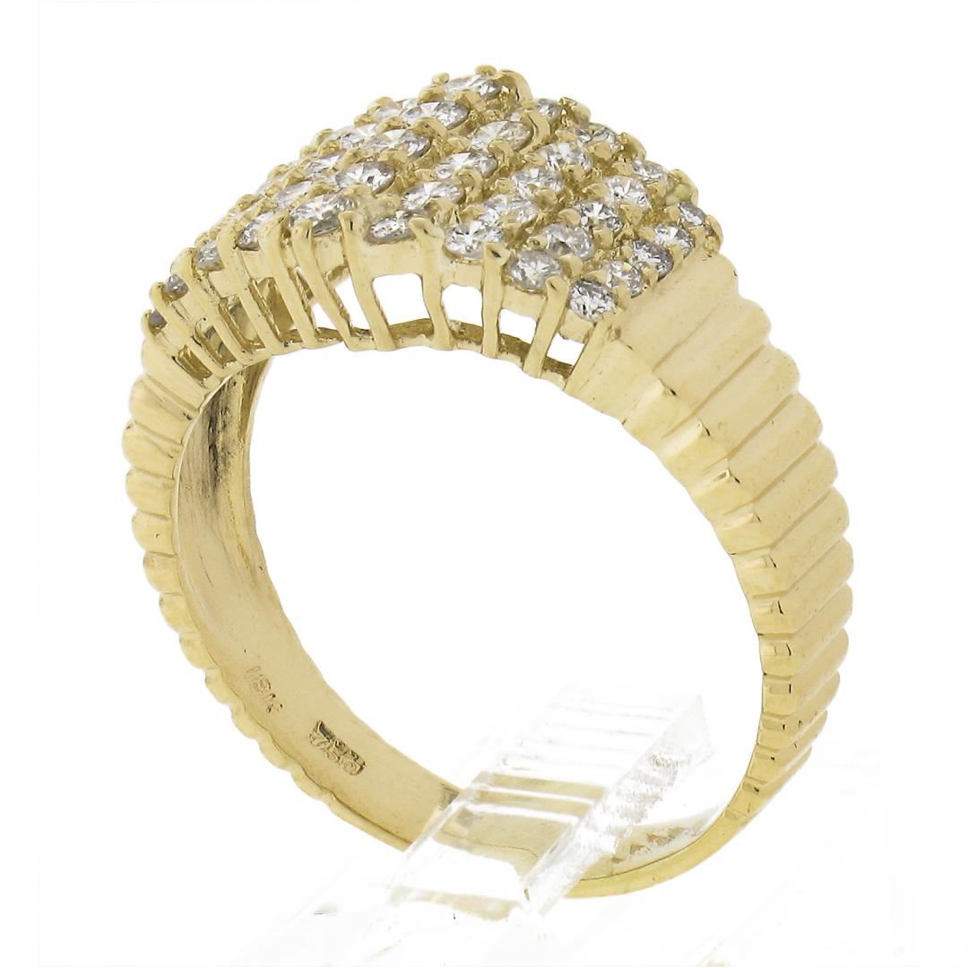 A solid 18k yellow gold band ring, with 45 round cut natural diamonds (G-I - VS1-I1 ; 1ctw ). The ring is size 9.5, weighs a total of 6.41 grams, and measures 11.8mm wide.