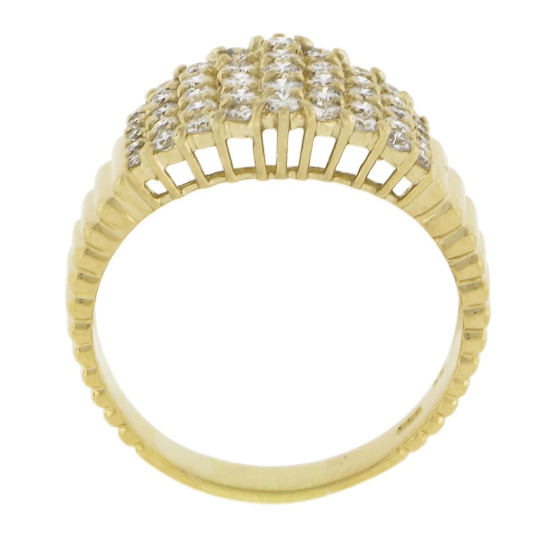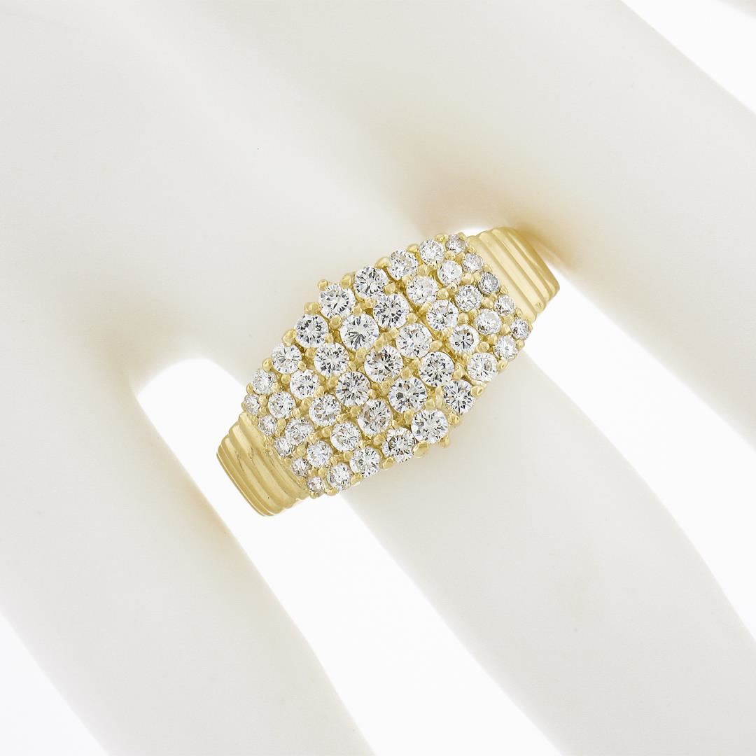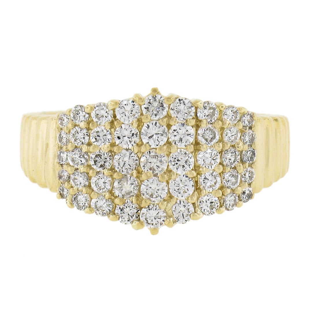 A solid 18k yellow gold band ring, with 45 round cut natural diamonds (G-I - VS1-I1 ; 1ctw ). The ring is size 9.5, weighs a total of 6.41 grams, and measures 11.8mm wide.