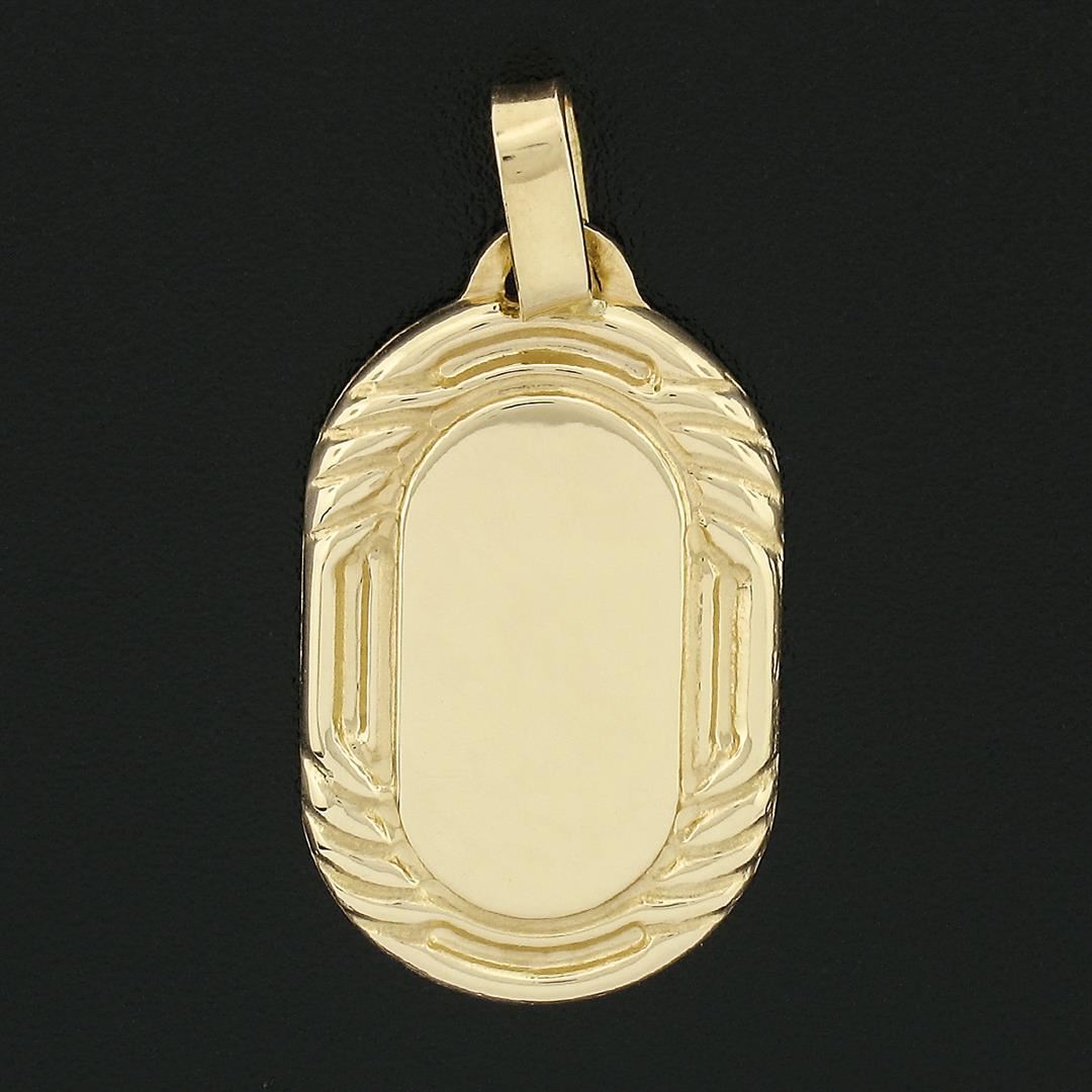 A solid 18k yellow gold engravable pendant. The pendant weighs a total of 2.74 grams, measures 30.99x15.14mm including the bail, and the inside of the bail measures 4.7x3.3mm.