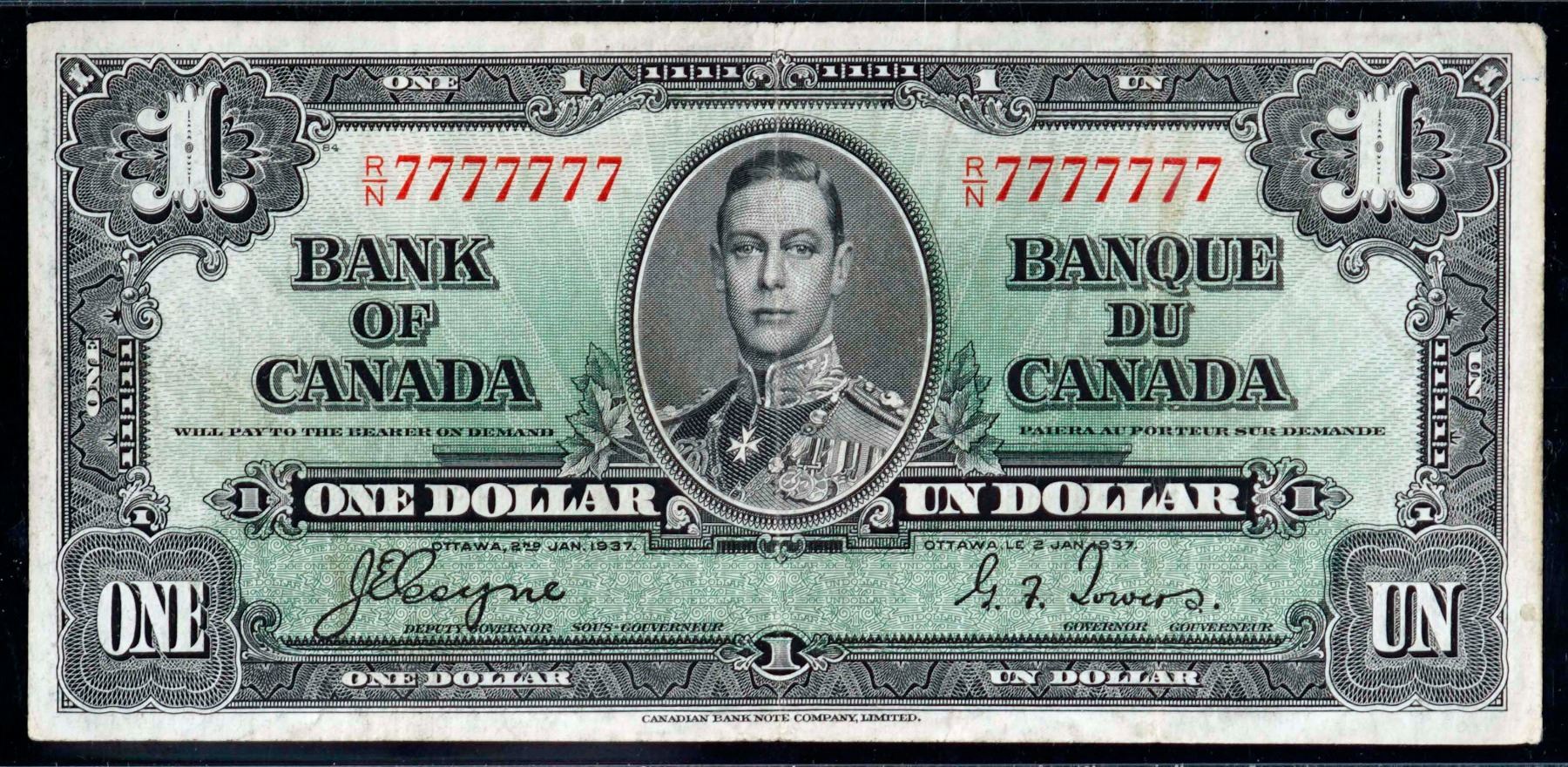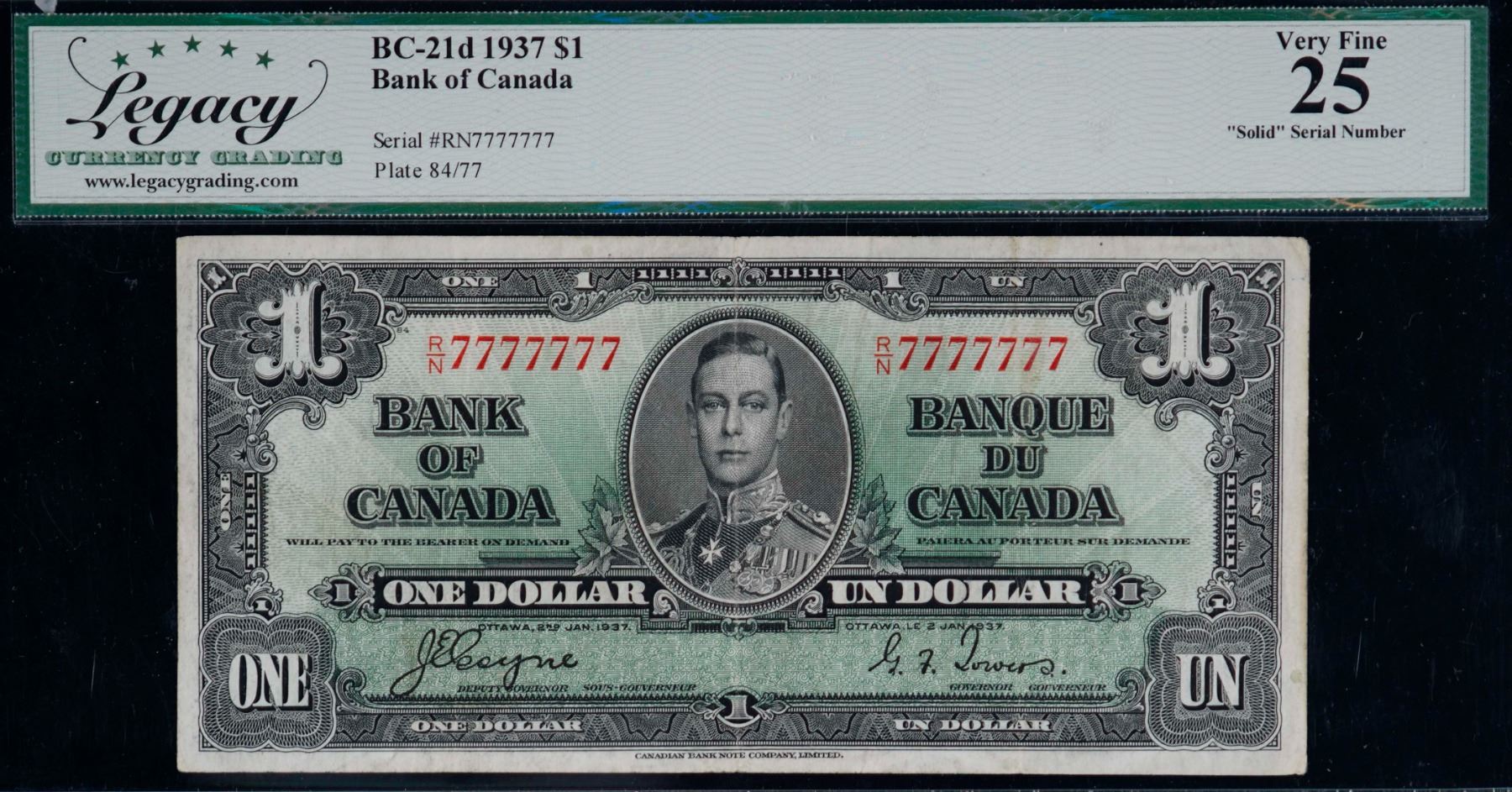 Solid; 1937 $1 BC-21d #R/N7777777 Legacy Choice Very Fine-25. Rarely seen and offered!