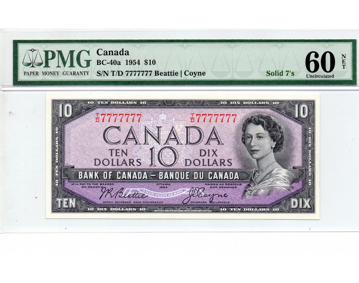 Solid; 1954 $10 BC-40a Solid #TD7777777, PMG UNC60.