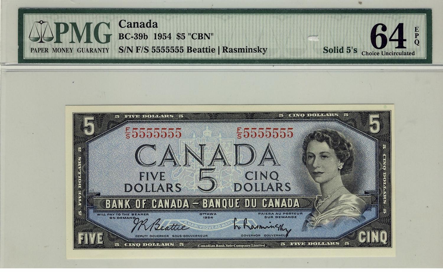 Solid 1954 $5 BC-39b #F/S5555555, PMG UNC64PPQ.