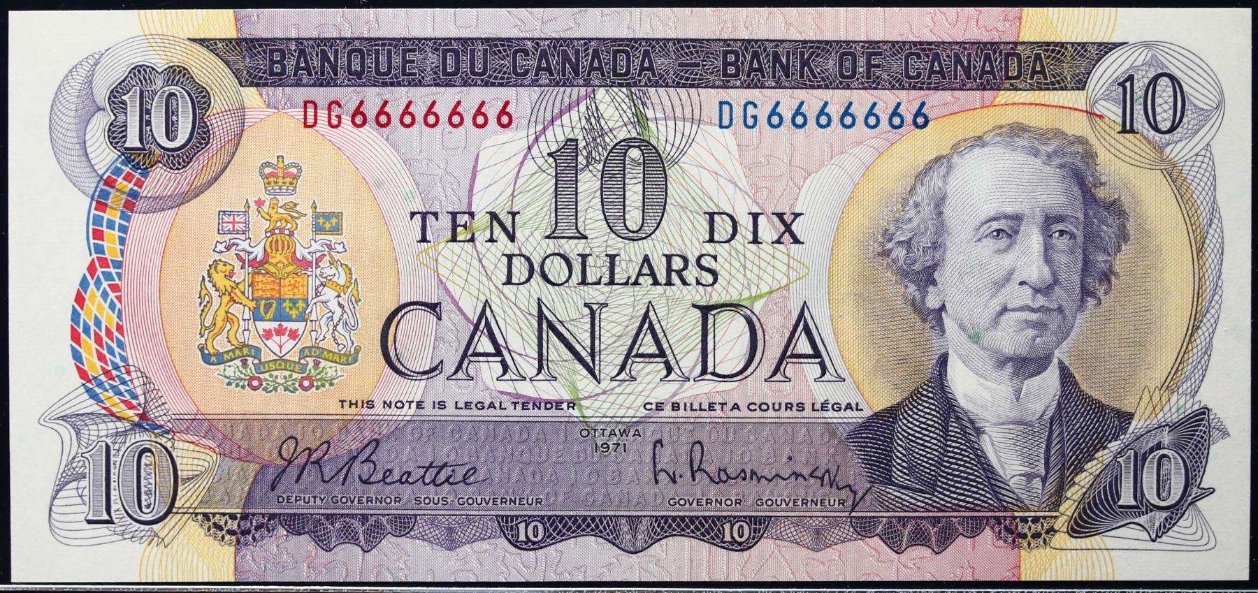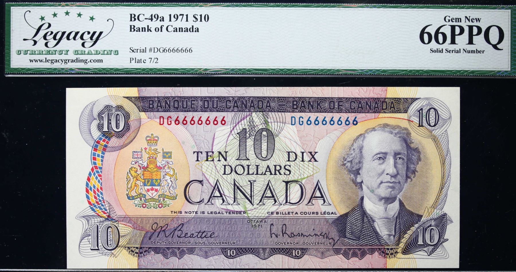 Solid; 1971 $10 BC-49A #DG-6666666 LCG Superb Gem Uncirculated-66PPQ