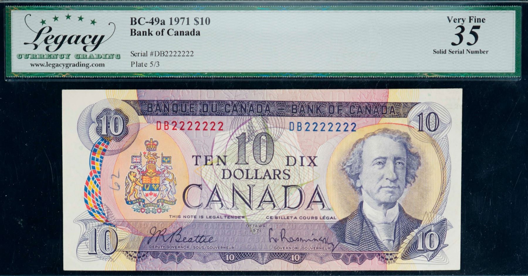 Solid; 1971 $10 BC-49a #DB2222222, Legacy Choice Very Fine-35 with minor issues.