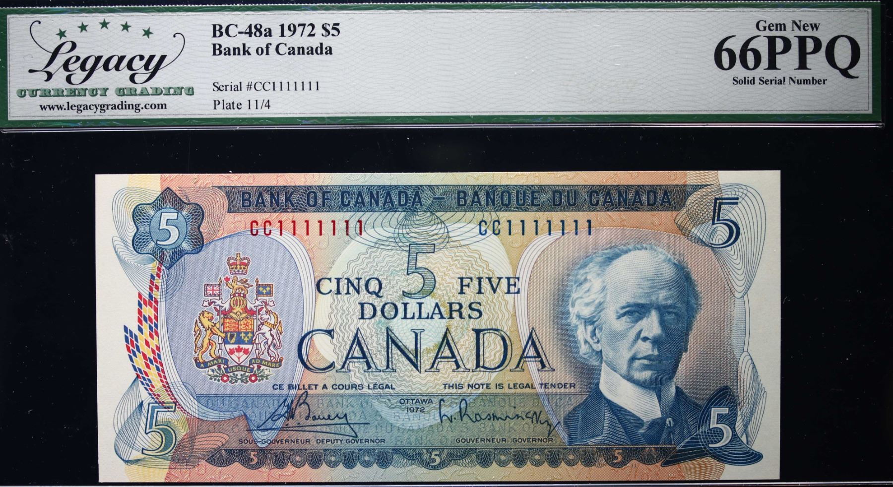 Solid; 1972 $5 BC-48A #CC1111111 LCG Superb Gem Uncirculated-66PPQ