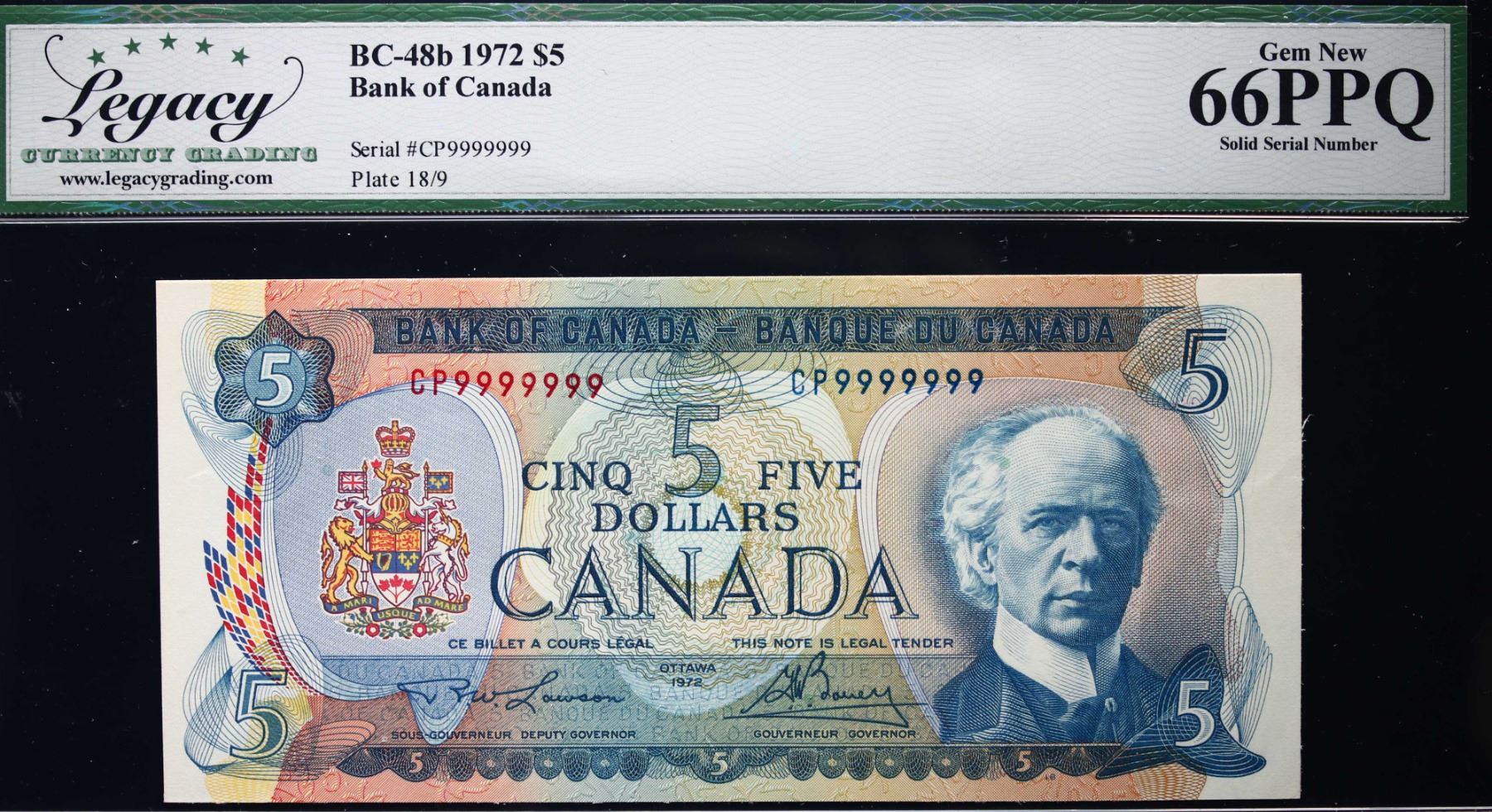 Solid; 1972 $5 BC-48B #CP9999999 LCG Superb Gem Uncirculated-66PPQ