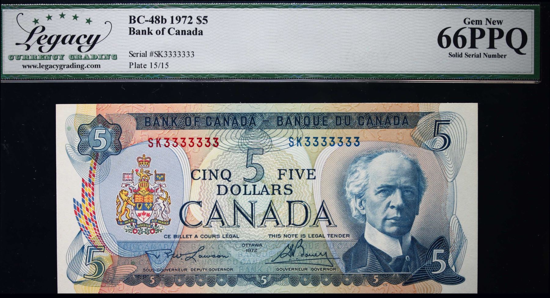 Solid; 1972 $5 BC-48B #SK3333333 LCG Superb Gem Uncirculated-66PPQ