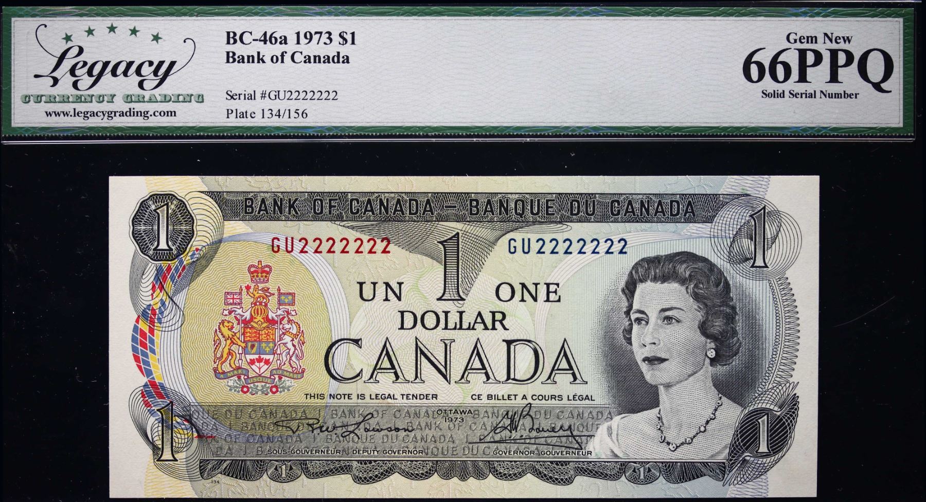 Solid; 1973 $1 BC-46A #GU2222222 LCG Superb Gem Uncirculated-66PPQ