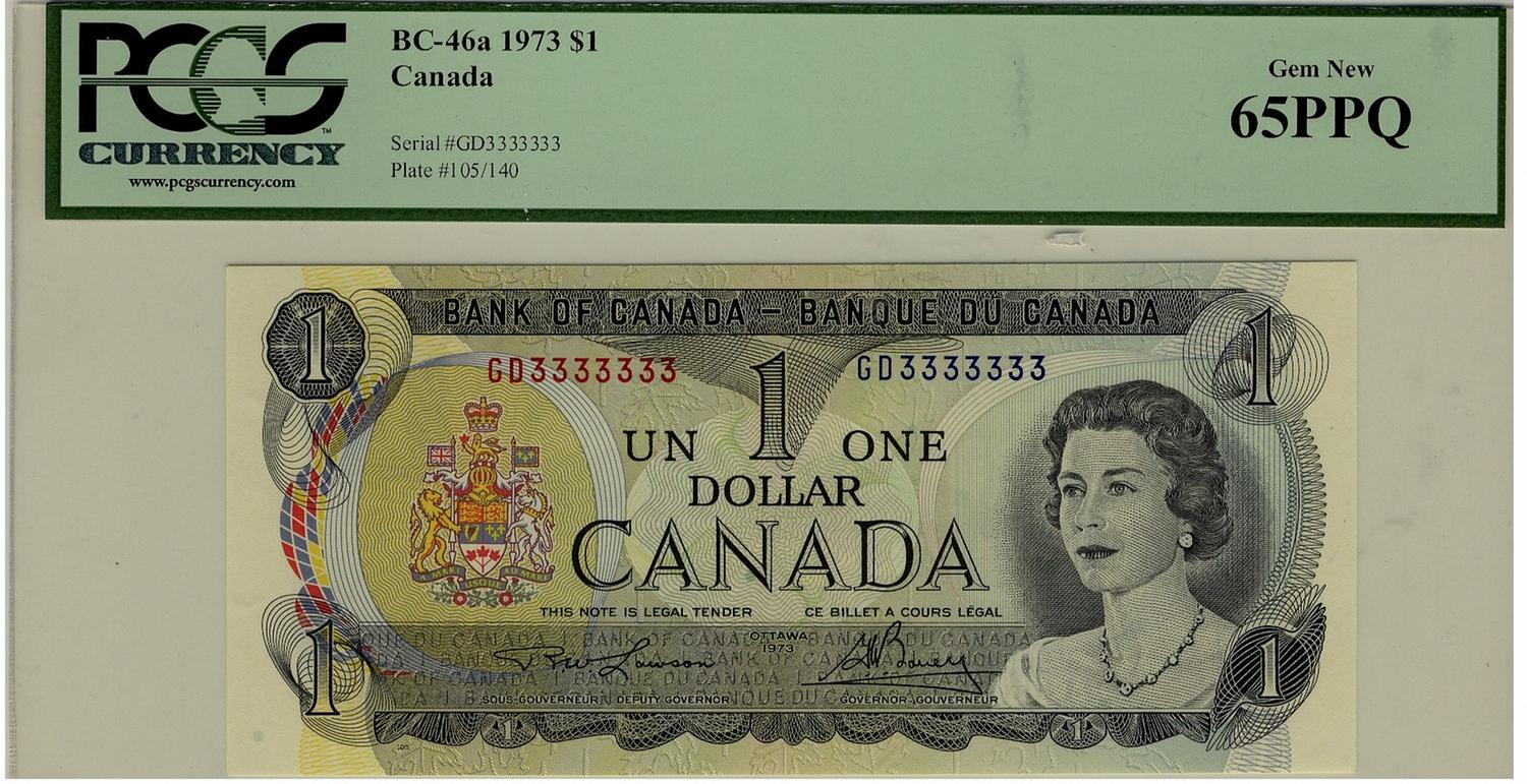 Solid 1973 $1 BC-46a #GD3333333, PCGS Gem UNC65PPQ.