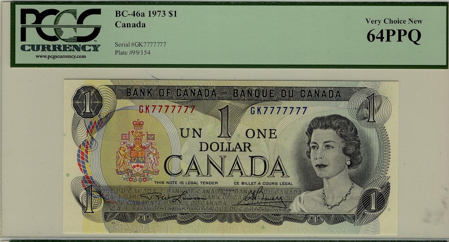 Solid 1973 $1 BC-46a #GK7777777, PCGS CH UNC64PPQ.