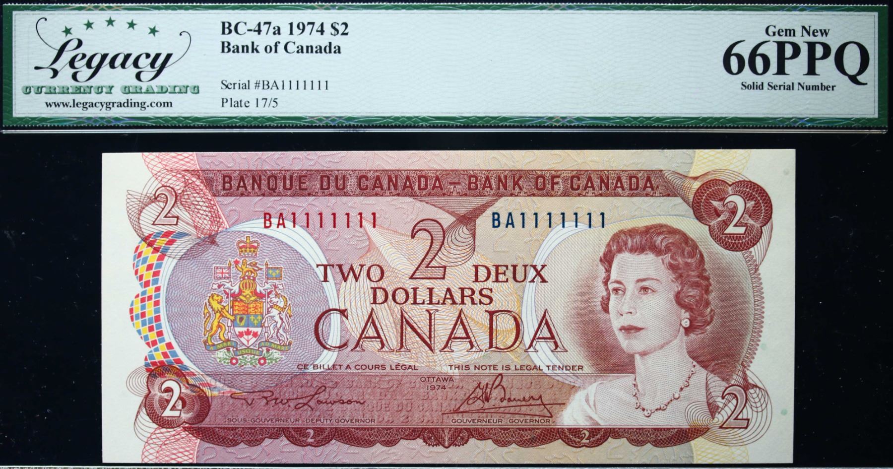 Solid; 1974 $2 BC-47A #BA1111111 LCG Superb Gem Uncirculated-66PPQ