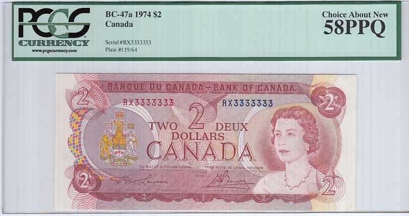 Solid; 1974 $2 BC-47a Solid #RX3333333 PCGS CH AU58PPQ.