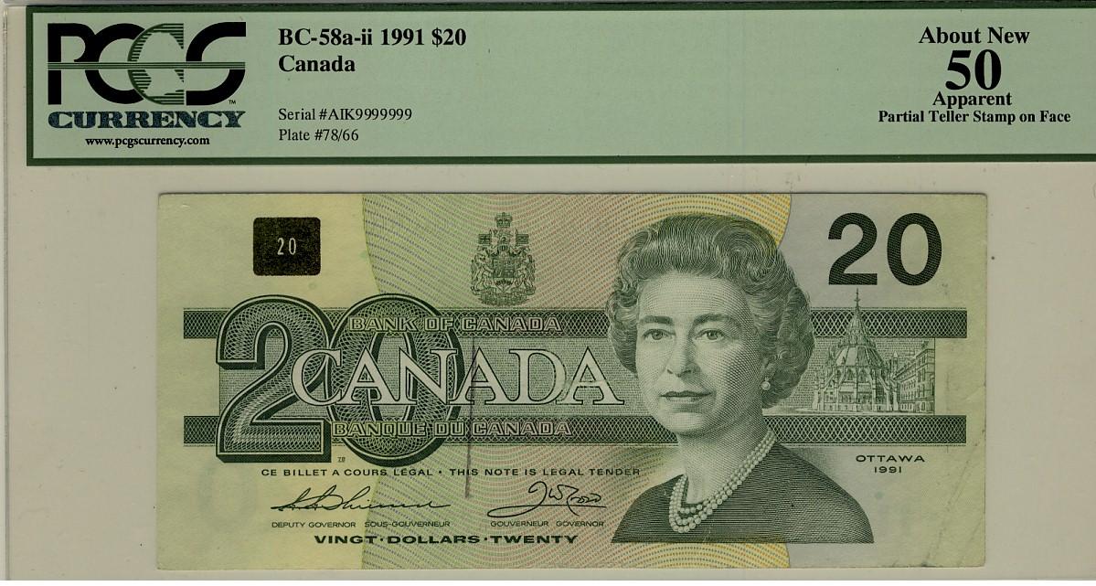 Solid 1991 $20 BC-58a-ii AIK9999999 PCGS AU50App