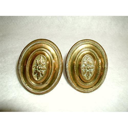 Pair of vintage C.1920-30 English oval solid brass finials with threaded ends. Can be used as stunning drapery tiebacks or towel hooks as well. Flower motif in the center of each with tiny beading along the outer edge. Wonderful patina to the aged brass. Excellent condition. Measure 3H X 2.25W X 2 inch projection plus threaded ends.