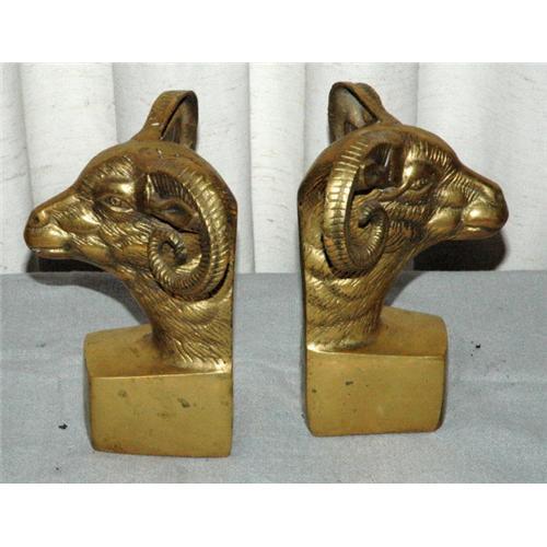 Brass Ram's Head Bookends. They measure 6 3/4" tall. They appear to be solid brass over plaster core. The condition is excellent on both other than some patina.