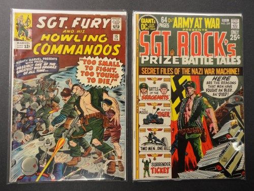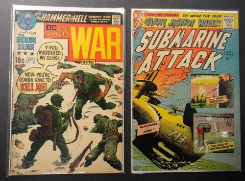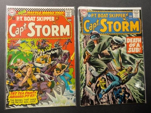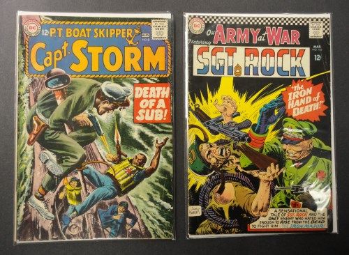 Includes: Star Spangled War Stories #155 March 1974 "Good" (Very Small Water Stain & 2 Shallow Creases Front Cover). Sgt. Fury #15 Feb 1965 (Ditko Art) "Good+" (Cover Wrinkles). Our Army At War #229 March 1971 "Fine". Our Army At War #165 March 1966 "Good+ to VG". Capt. Storm #8 August 1965 "Good+ to VG" . Capt. Storm #12 April 1966 "Fine". Capt. Storm #8 August 1965 "VG". Submarine Attack #17 July 1959 "VG". Total Overstreet Book Value Adjusted for Condition $95.00. Est. Value $95.00 - $115.00.